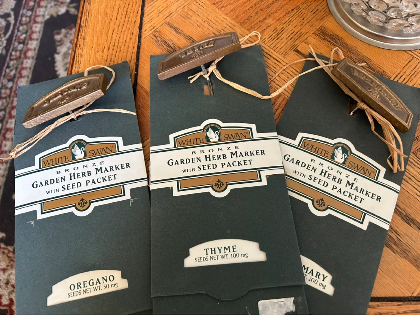 Set of three White Swan bronze garden herb markers, each with a seed packet. Includes Oregano (50 mg seeds), Thyme (100 mg seeds), and Rosemary (200 mg seeds). These markers are great for identifying your herbs in the garden!