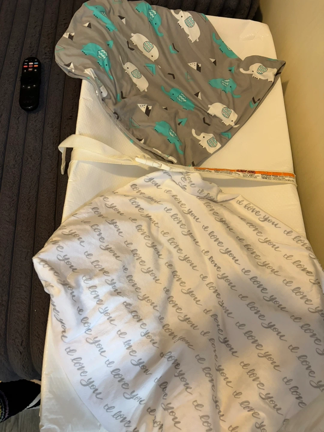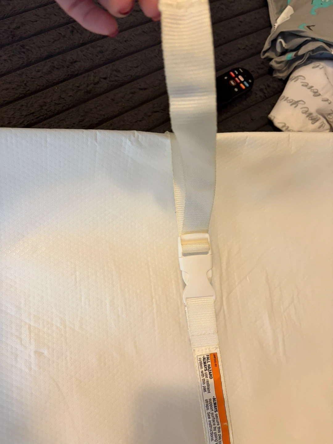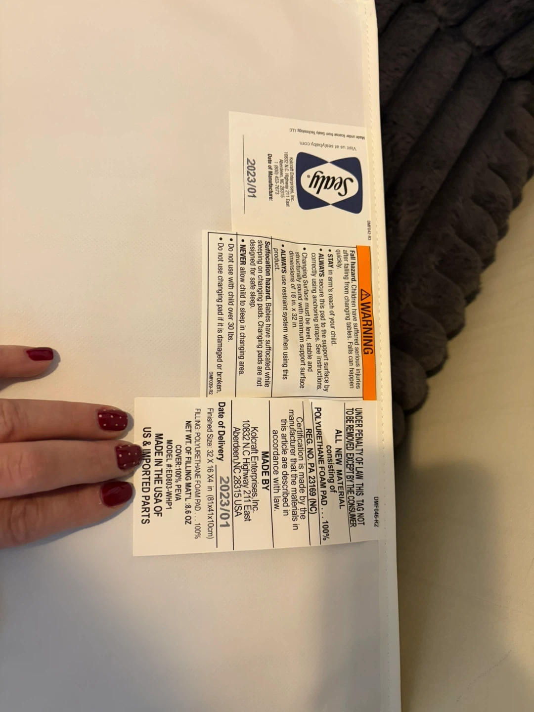 This is a Sealy contoured changing pad. It's made with polyurethane foam and polyvinyl chloride. The pad measures 32 x 18 x 4 inches. Includes a safety strap.