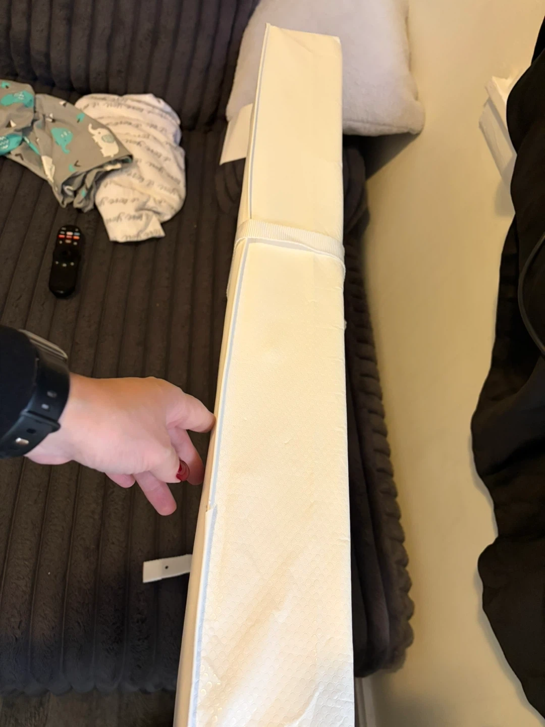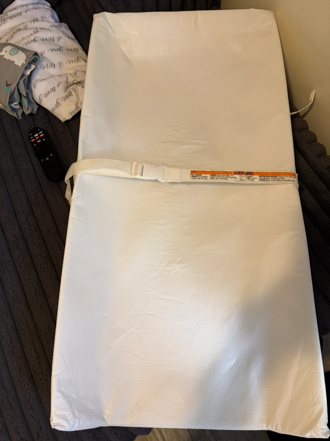 This is a Sealy contoured changing pad. It's made with polyurethane foam and polyvinyl chloride. The pad measures 32 x 18 x 4 inches. Includes a safety strap.