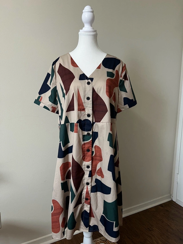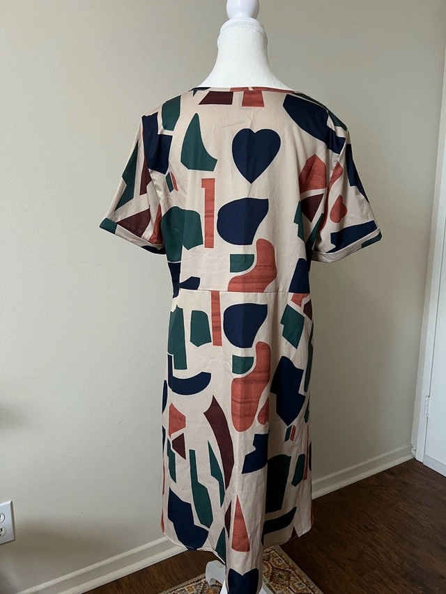 This vibrant and stylish patterned dress is perfect for adding a pop of colour to your wardrobe, featuring a comfortable fit and unique design. This dress is in used condition.