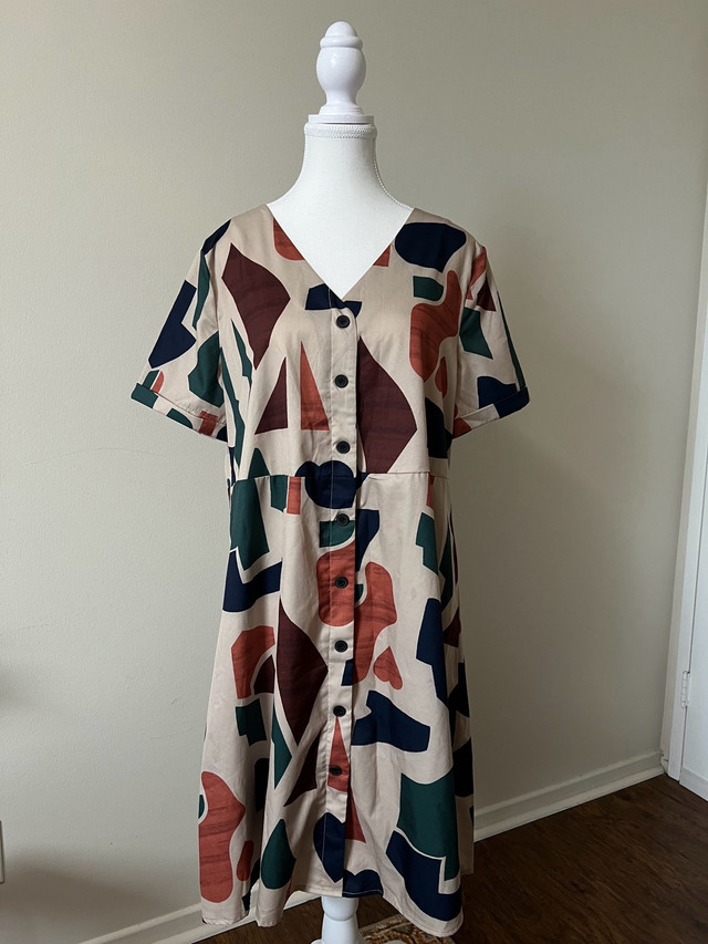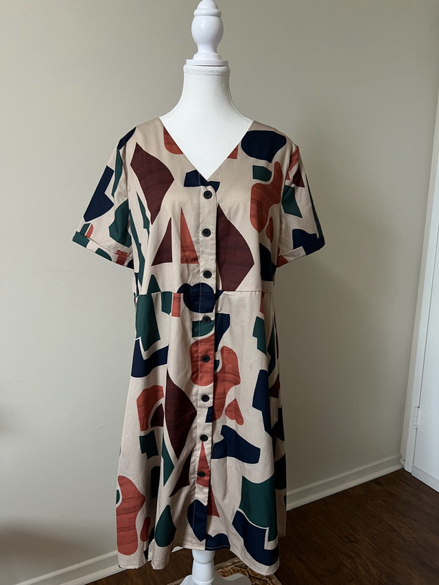 This vibrant and stylish patterned dress is perfect for adding a pop of colour to your wardrobe, featuring a comfortable fit and unique design. This dress is in used condition.