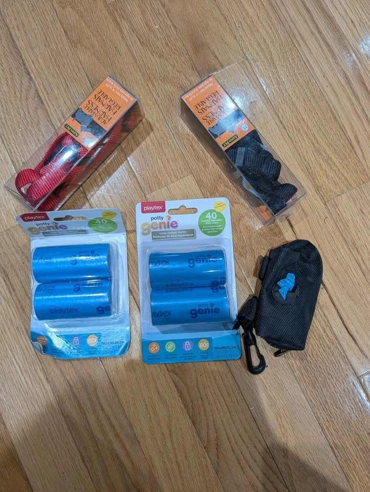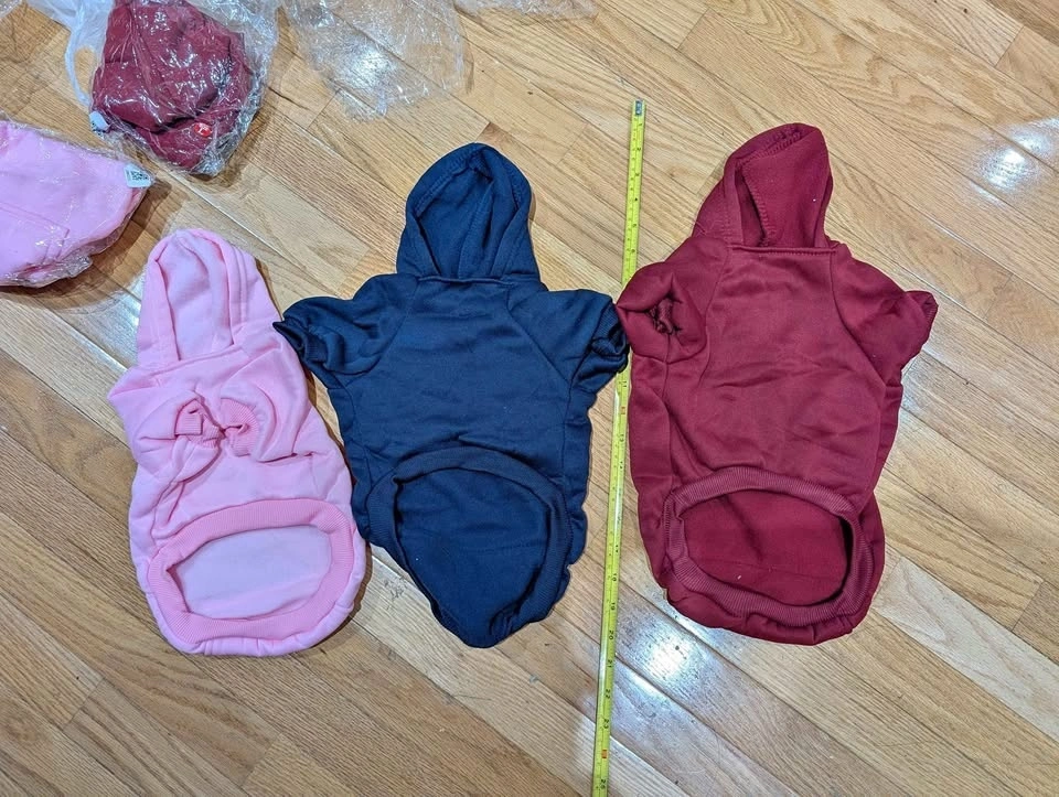 New Dog clothes, keep warm, keep clean, pet bag, dog rope. $10 for 3 pieces. $5 each. A few dog can food for free if available.