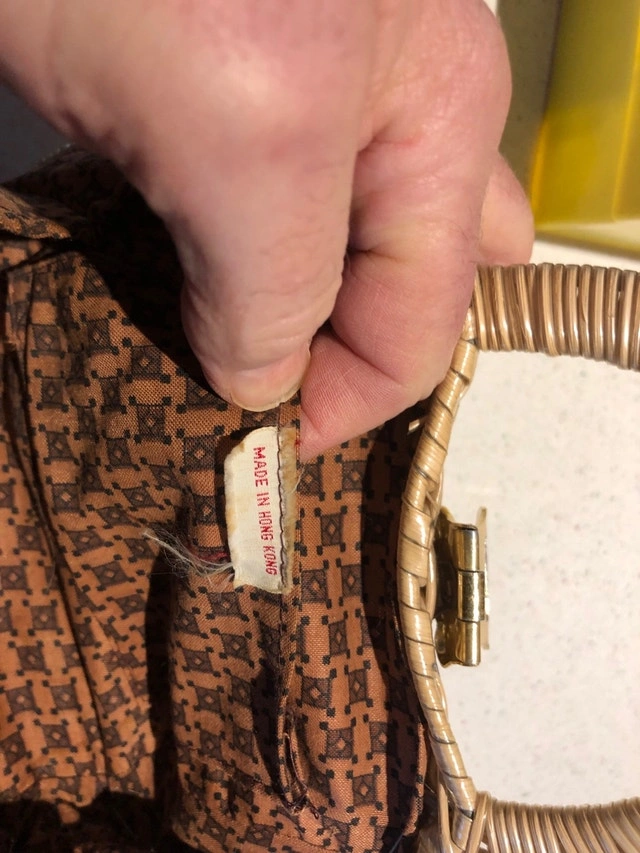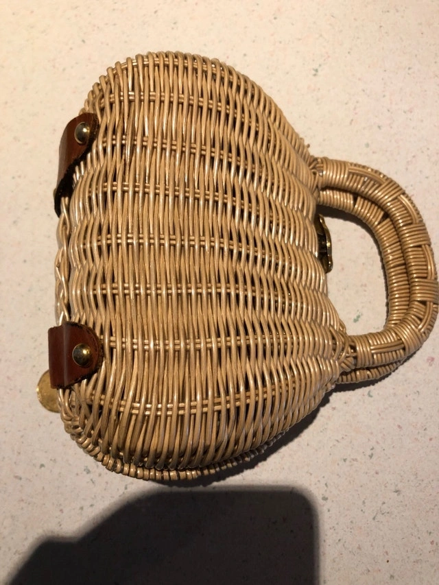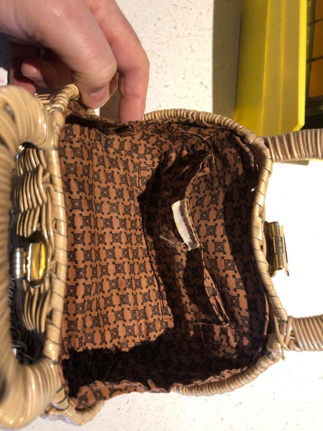 This is a charming vintage wicker Children’s purse made in Hong Kong, featuring a unique design with a chain accent. The purse is in used condition, with some signs of wear that add to its vintage appeal. The interior is lined with a patterned fabric. This stylish bag is perfect for adding a touch of retro flair to any outfit. If you are reading this, this wicker purse is still available! Asking price is $7.