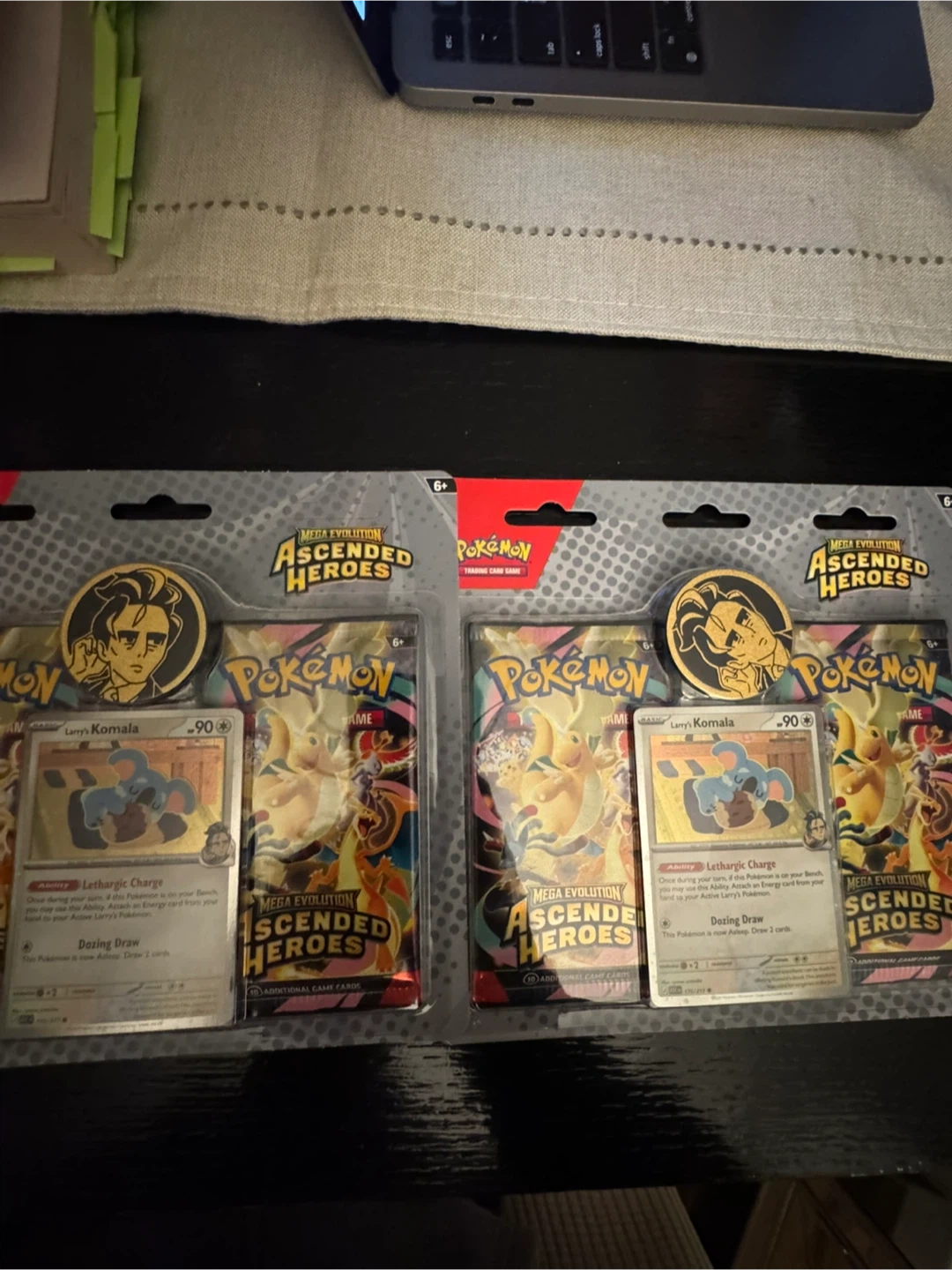 Two Pokemon Mega Evolution Ascended Heroes trading card game packs are included. Each pack contains additional game cards and a coin featuring artwork. One specific card featuring Larry's Komala is also shown.