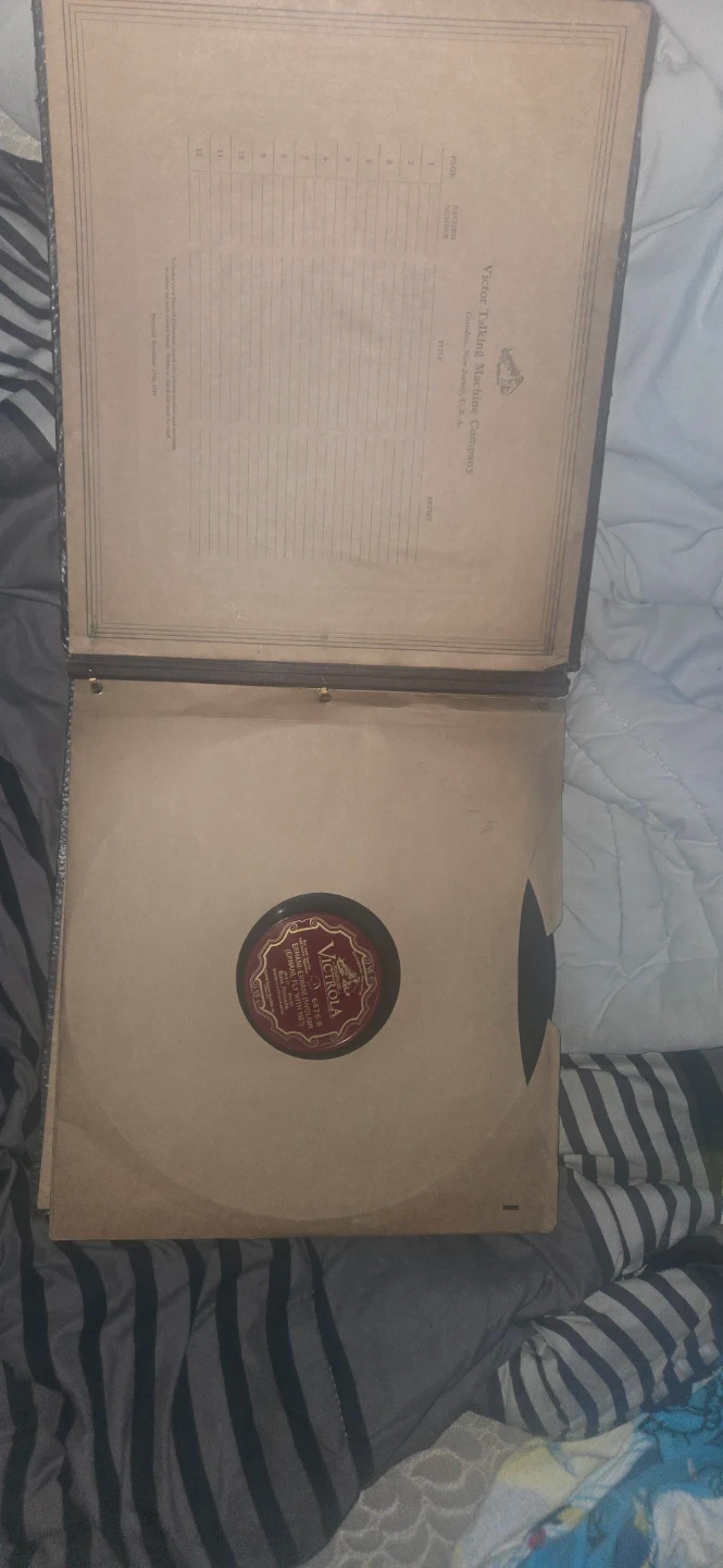 This is a Victrola 78 RPM record featuring Enrico Caruso singing "Elixir d'Amore" (Una furtiva lagrima). The record is in a Victrola record album. The album has an index for cataloging records.