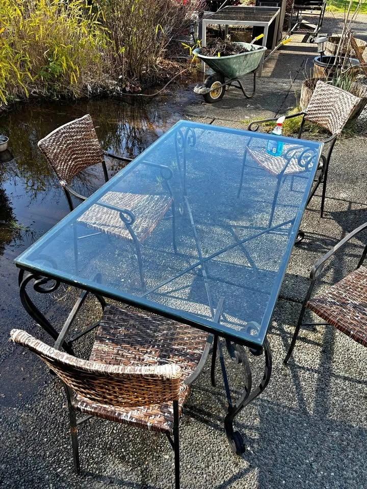 Beautiful iron-frame dining table with glass top and 4 matching wicker chairs with padded cushions. Solid, heavy-duty iron construction. Glass tabletop in great condition. Includes 4 comfortable, well-padded cushions. Light weathering on the wicker chairs from outdoor use, easily covered with cushions. Freshly cleaned and ready to use. Perfect for both indoor dining or patio setup. Pickup only. It is very heavy, bring help! Great quality set that’s built to last, only selling because we’re changing up the space.