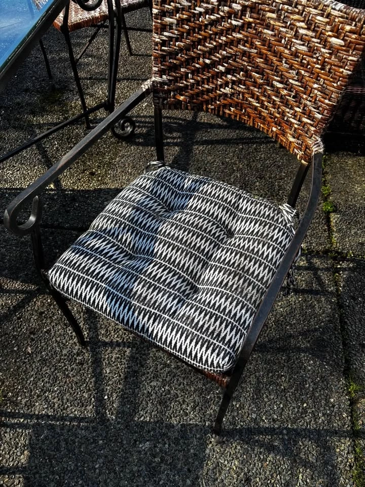 Beautiful iron-frame dining table with glass top and 4 matching wicker chairs with padded cushions. Solid, heavy-duty iron construction. Glass tabletop in great condition. Includes 4 comfortable, well-padded cushions. Light weathering on the wicker chairs from outdoor use, easily covered with cushions. Freshly cleaned and ready to use. Perfect for both indoor dining or patio setup. Pickup only. It is very heavy, bring help! Great quality set that’s built to last, only selling because we’re changing up the space.