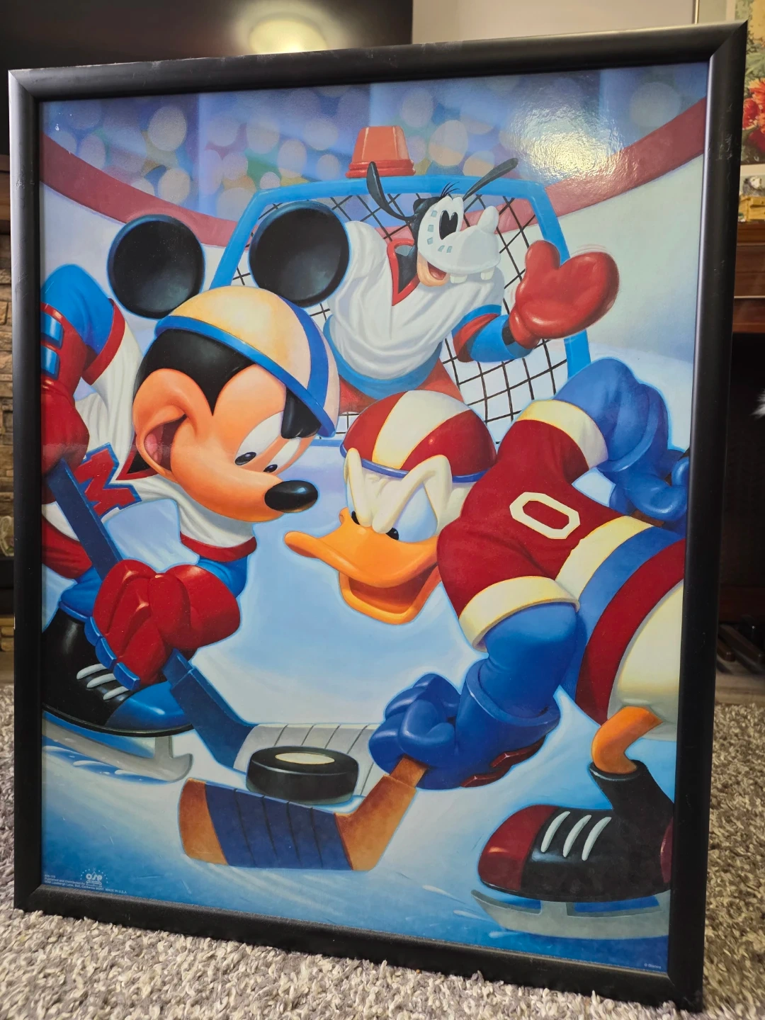 Framed print featuring Mickey Mouse, Donald Duck, and Goofy playing hockey. Expertly crafted with double-bonded corners and a 10-step quality check. Printed by AllPosters.com.