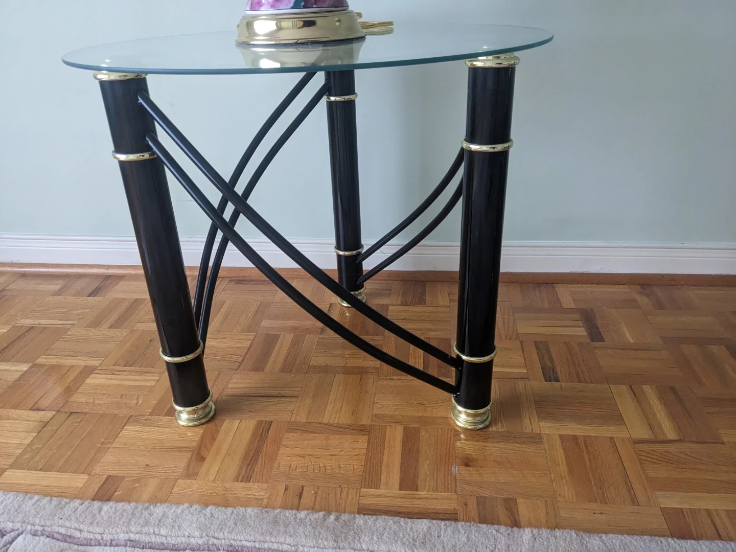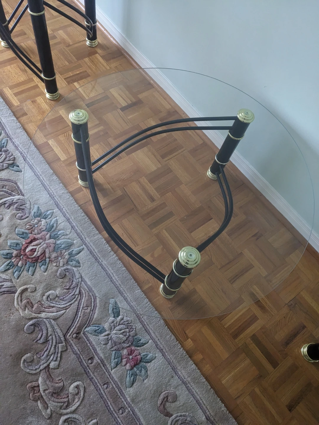 A stylish coffee table and end tables featuring a clear glass top and a unique black metal frame with gold accents. This piece adds a modern touch to any living space.