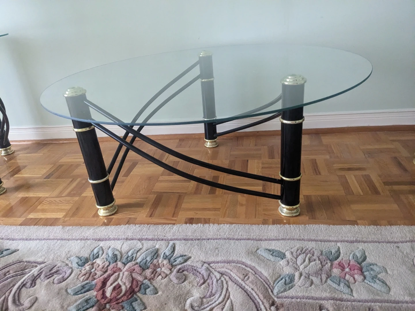 A stylish coffee table and end tables featuring a clear glass top and a unique black metal frame with gold accents. This piece adds a modern touch to any living space.