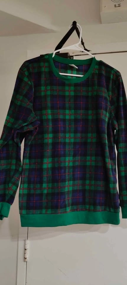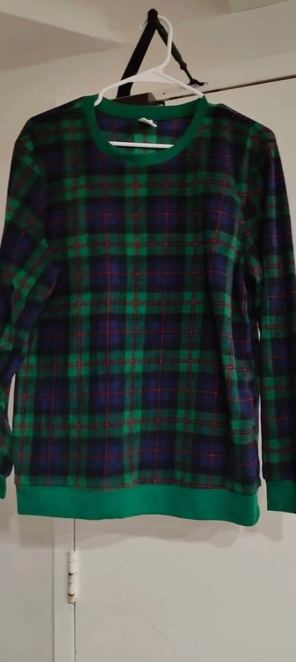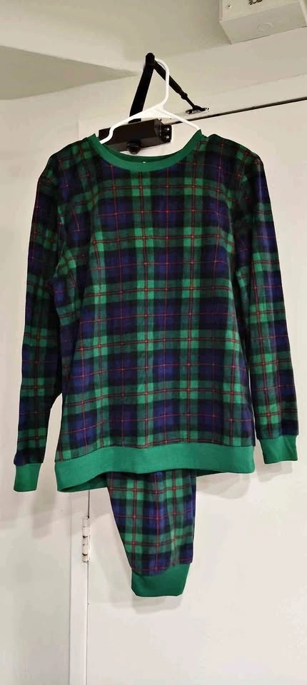 100% polyester microfleece body, 100% polyester rib-knit neck, cuffs & hem. Crew neck, long sleeves with drop shoulders, banded hem. Pull-on elasticized waistband, banded sleeve & leg cuffs, allover tartan plaid, side-brushed for softness; anti-pilling. Let me know if you're interested!