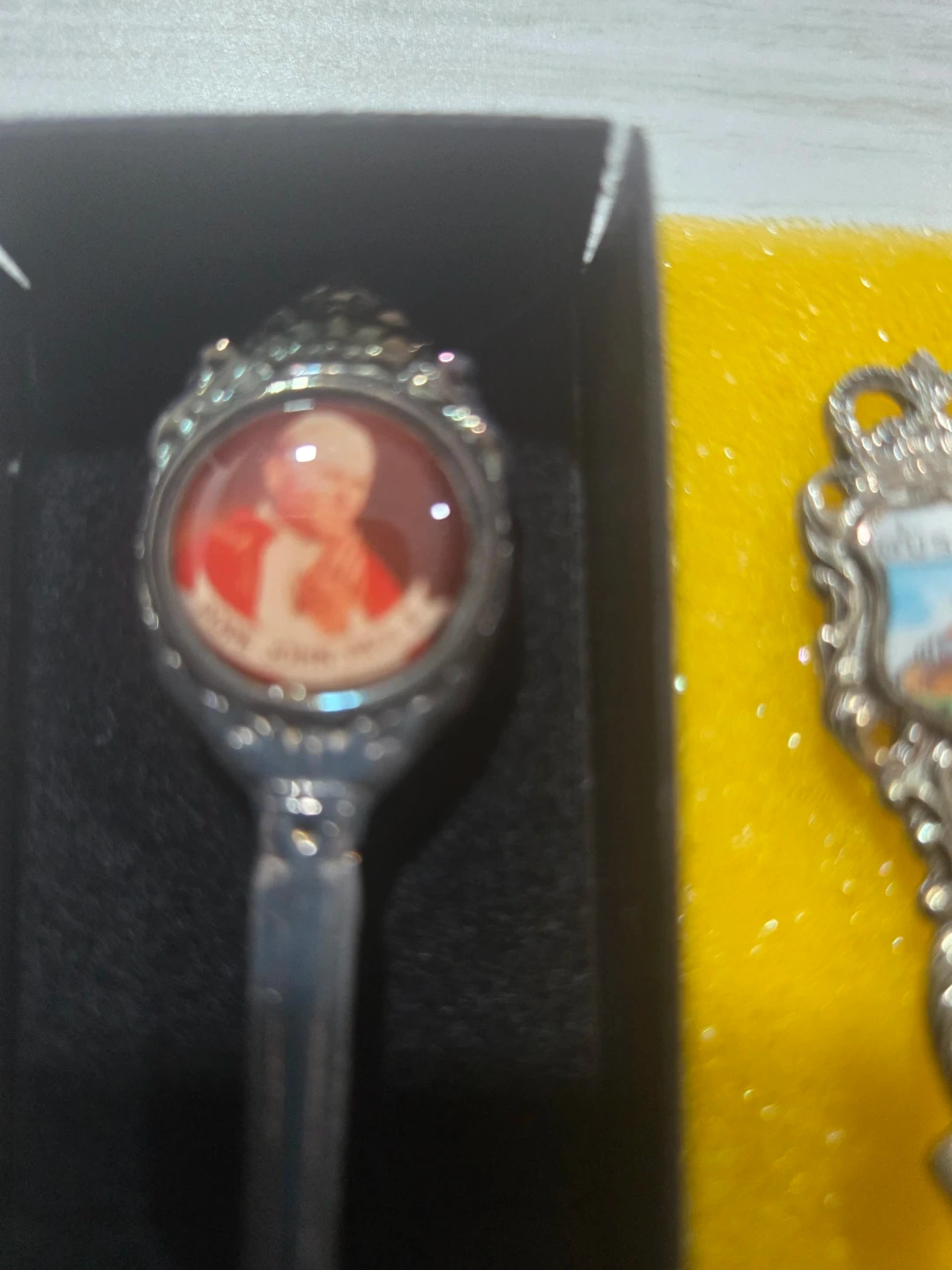 This set includes three decorative souvenir spoons. One spoon features Pope John Paul II, and another depicts a scene with the text 'MALTA'. The third spoon is from Gussing Austria .. They're presented in individual boxes, with two featuring yellow and red foam lining. All three $3 firm.