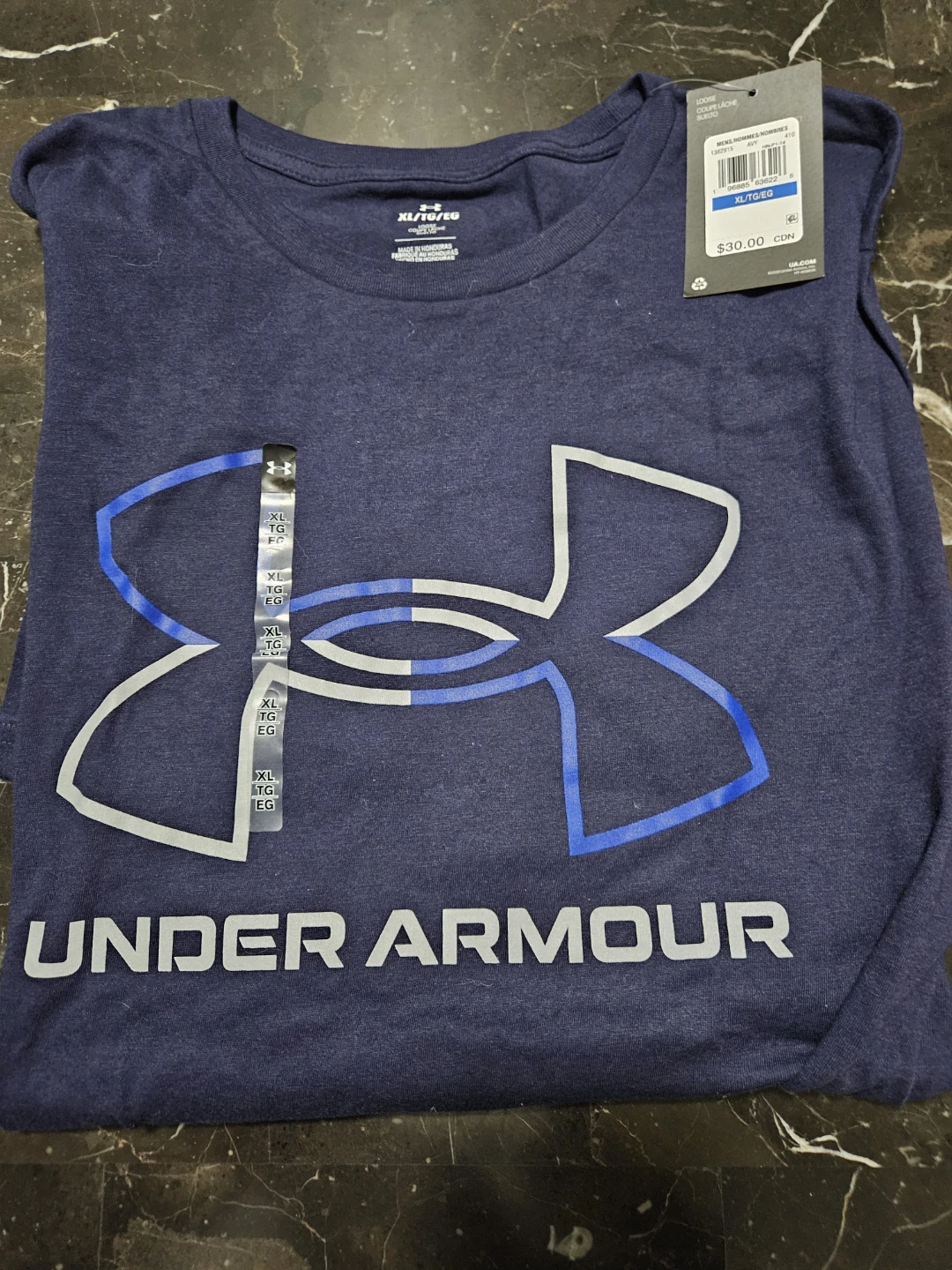 I'm selling a brand new Under Armour T-shirt, still with the tags on! It's a size XL and a nice dark blue colour. The original price on the tag says $30.00. Perfect for workouts or casual wear!