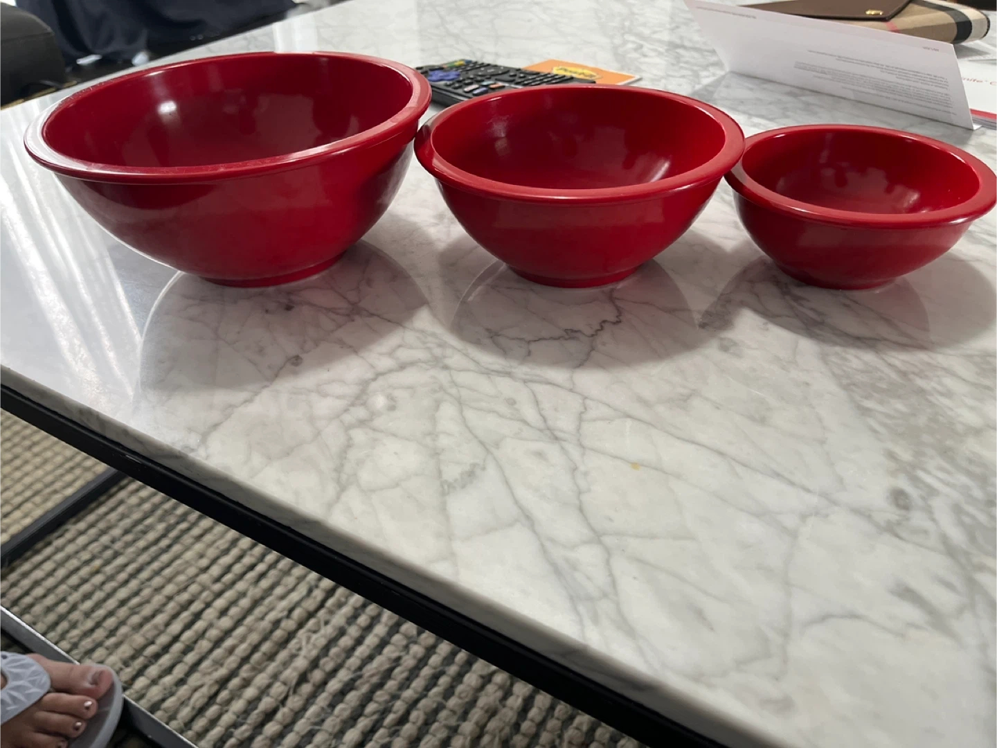 This is a set of three red mixing bowls. They are made of a durable plastic material. These bowls are useful for prepping ingredients or serving snacks.