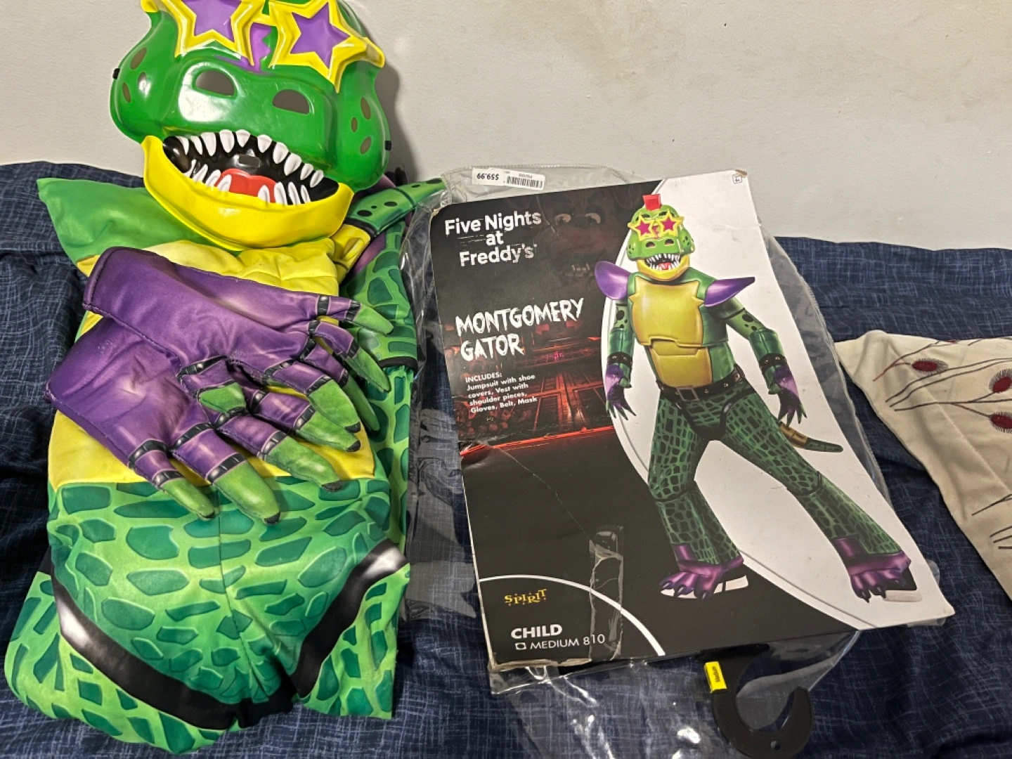 Selling Nights at Freddy's Montgomery Gator costume for kids. It includes a jumpsuit with shoe covers, hand covers, and a mask. Size is child medium 4-6