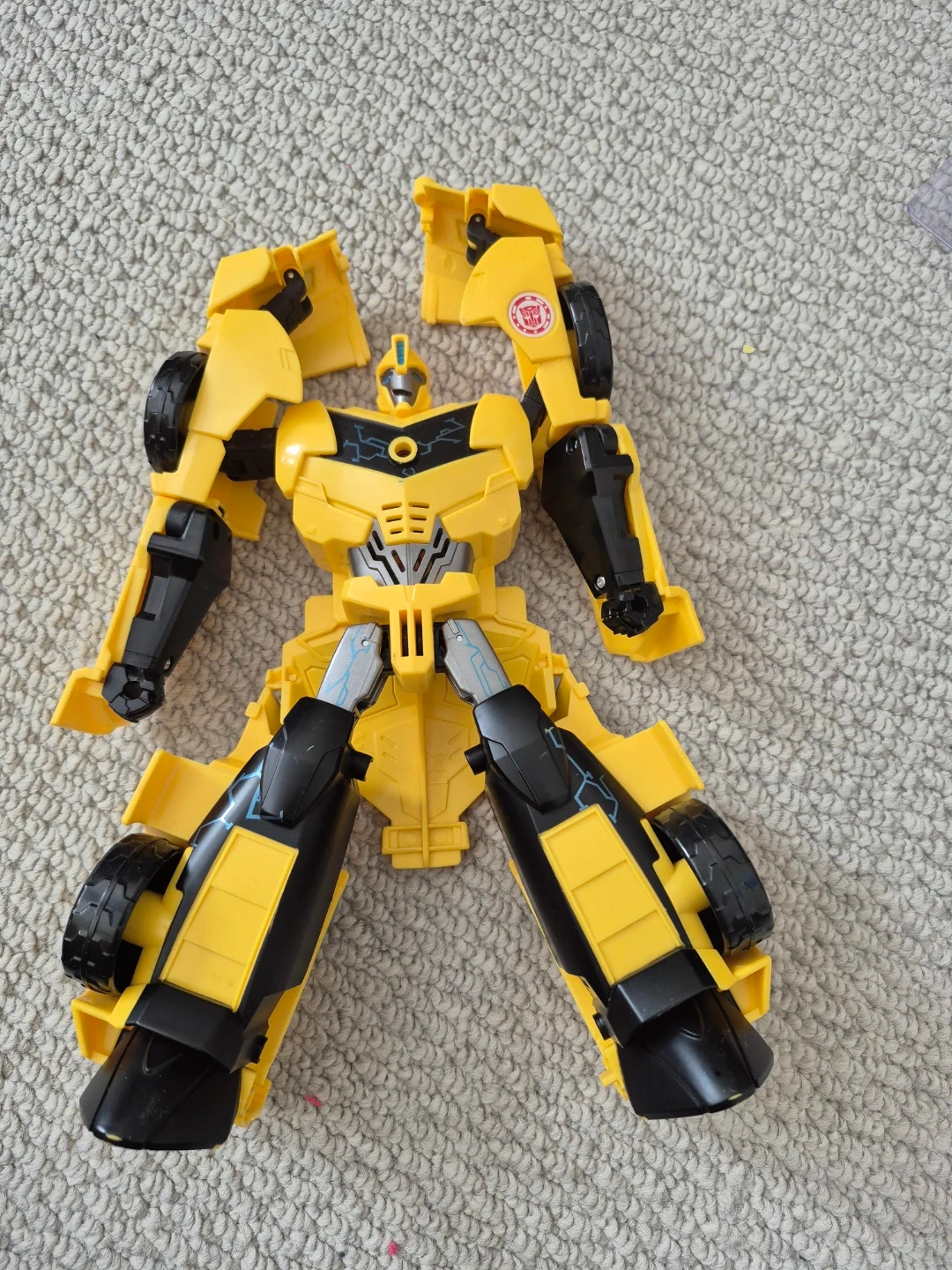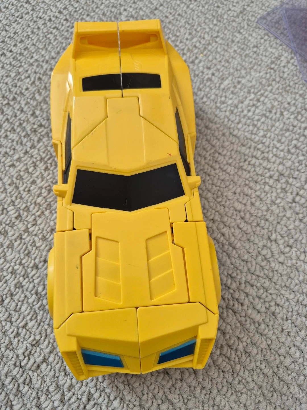 This is a yellow Transformers action figure that converts from a car to a robot. It features the Autobot logo and has blue accents on the car headlights. It's ready for transforming adventures!