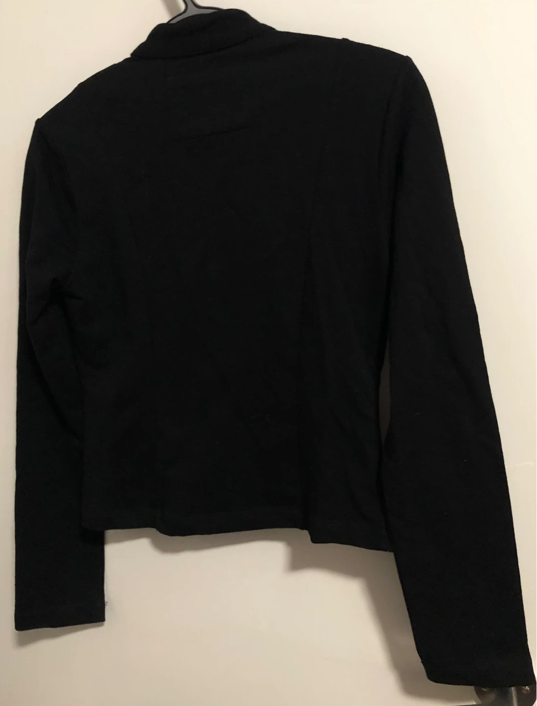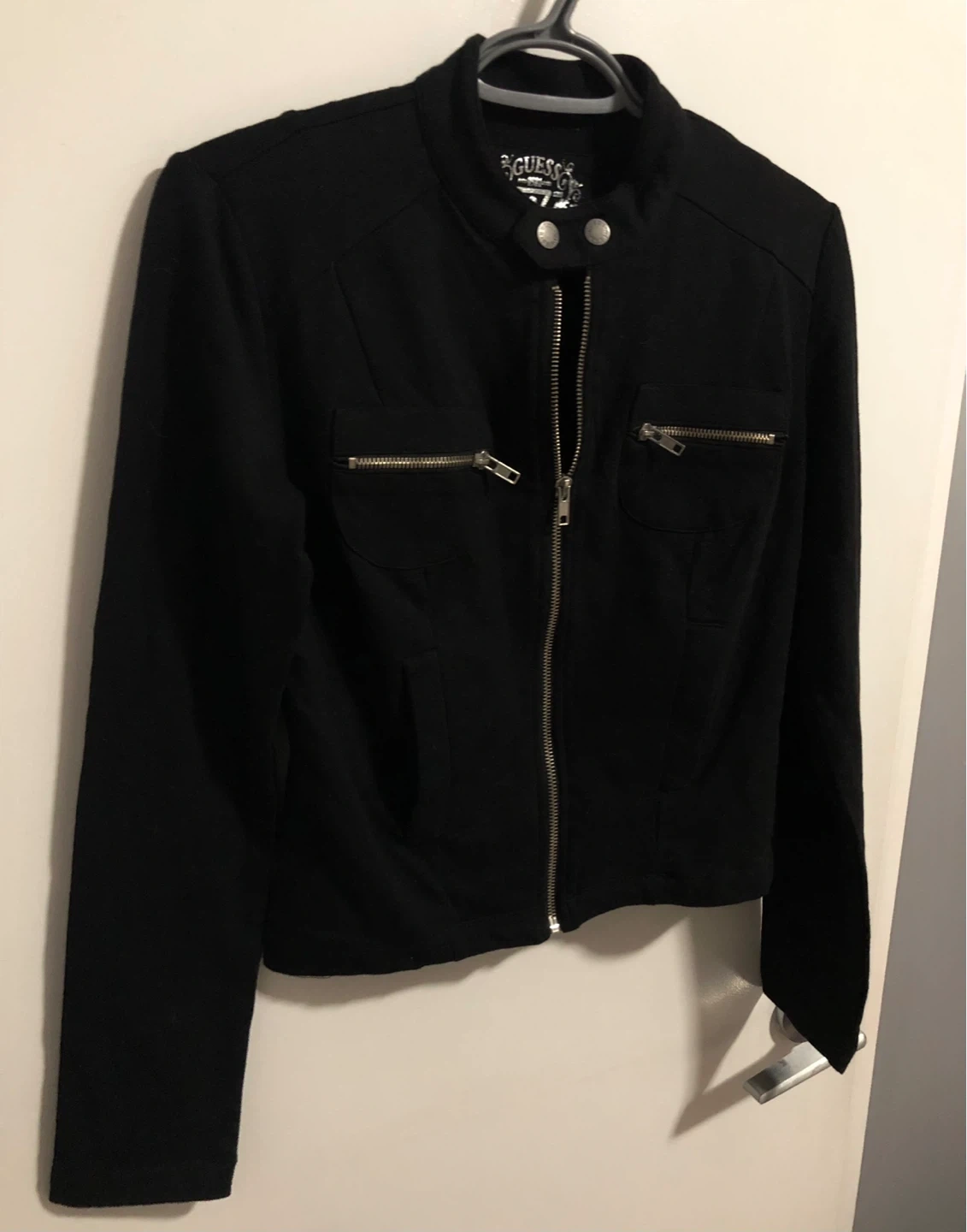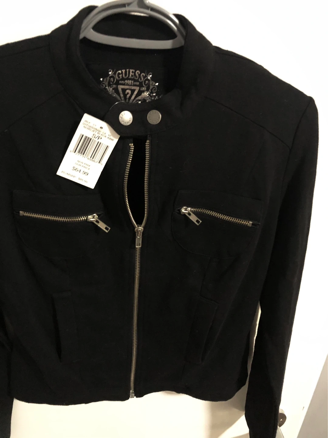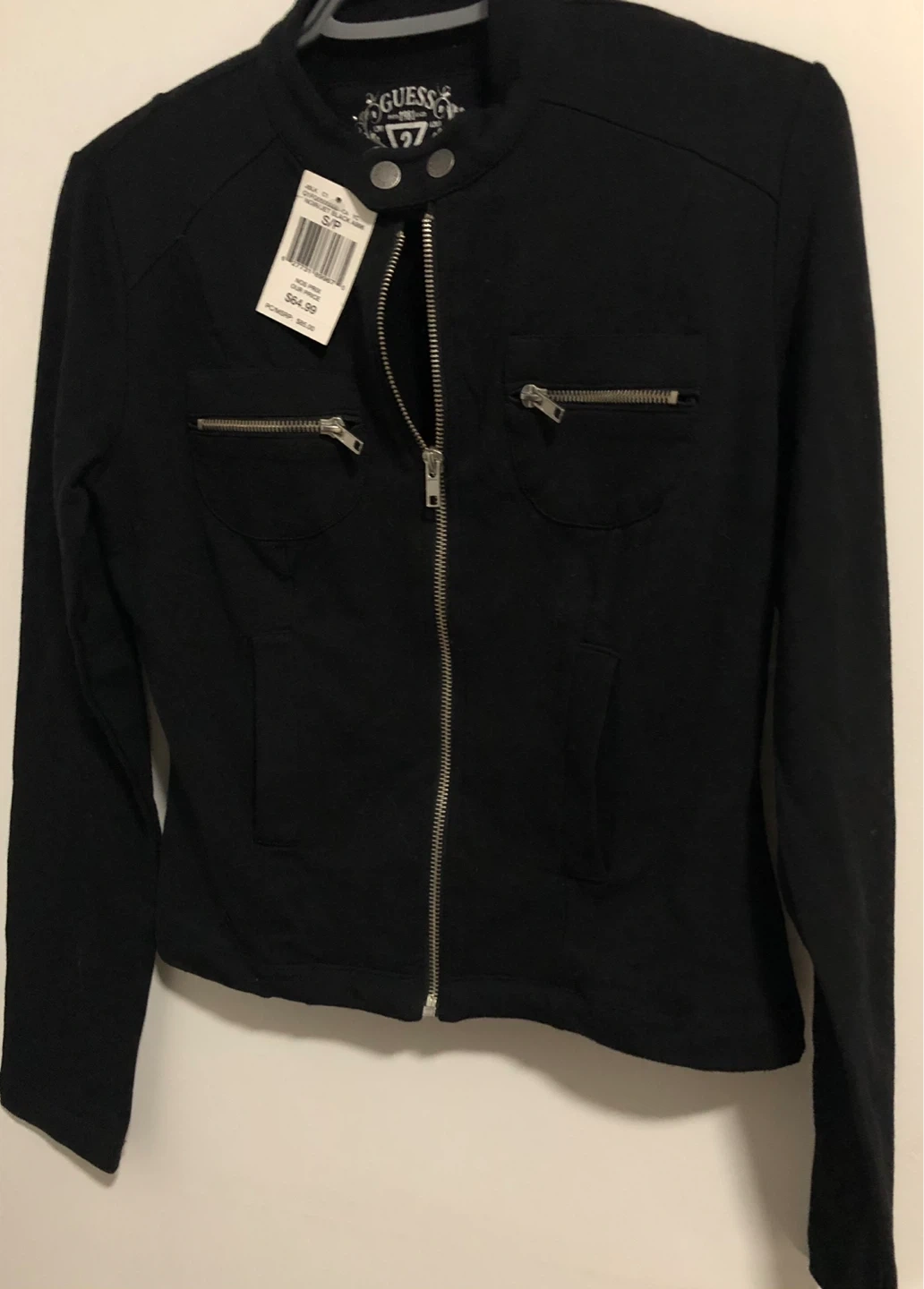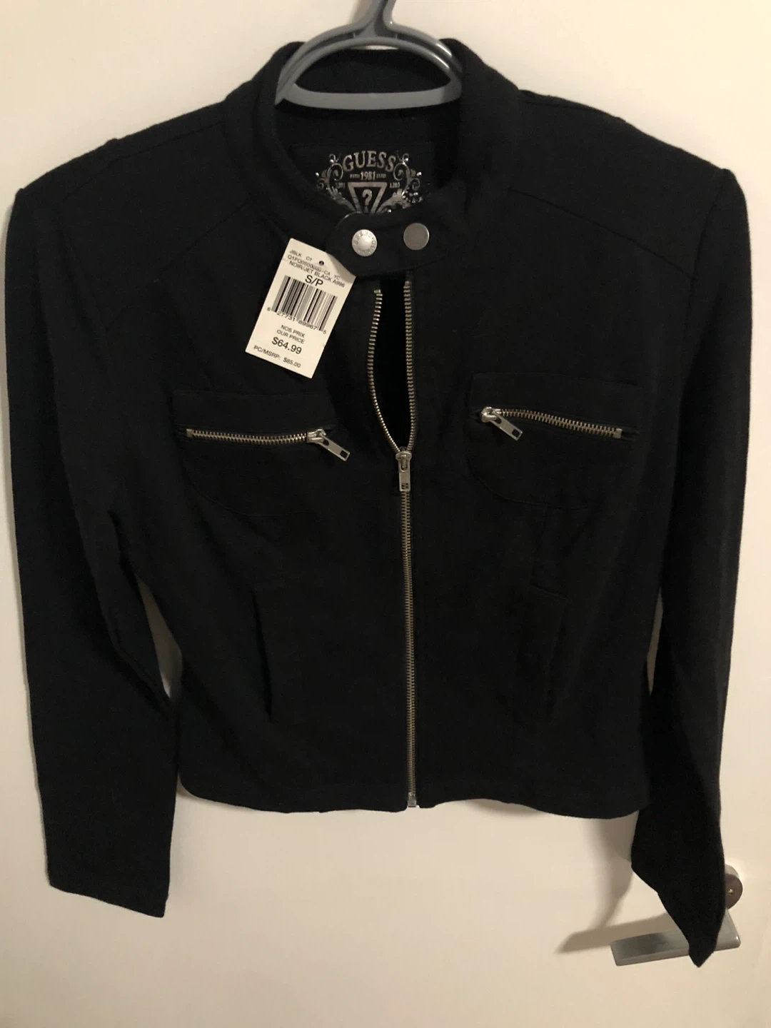 New with tags Black Guess sweater jacket with a zip-up front and zippered top pockets and 2 regular side pockets. Material is stretchy. Size is small.