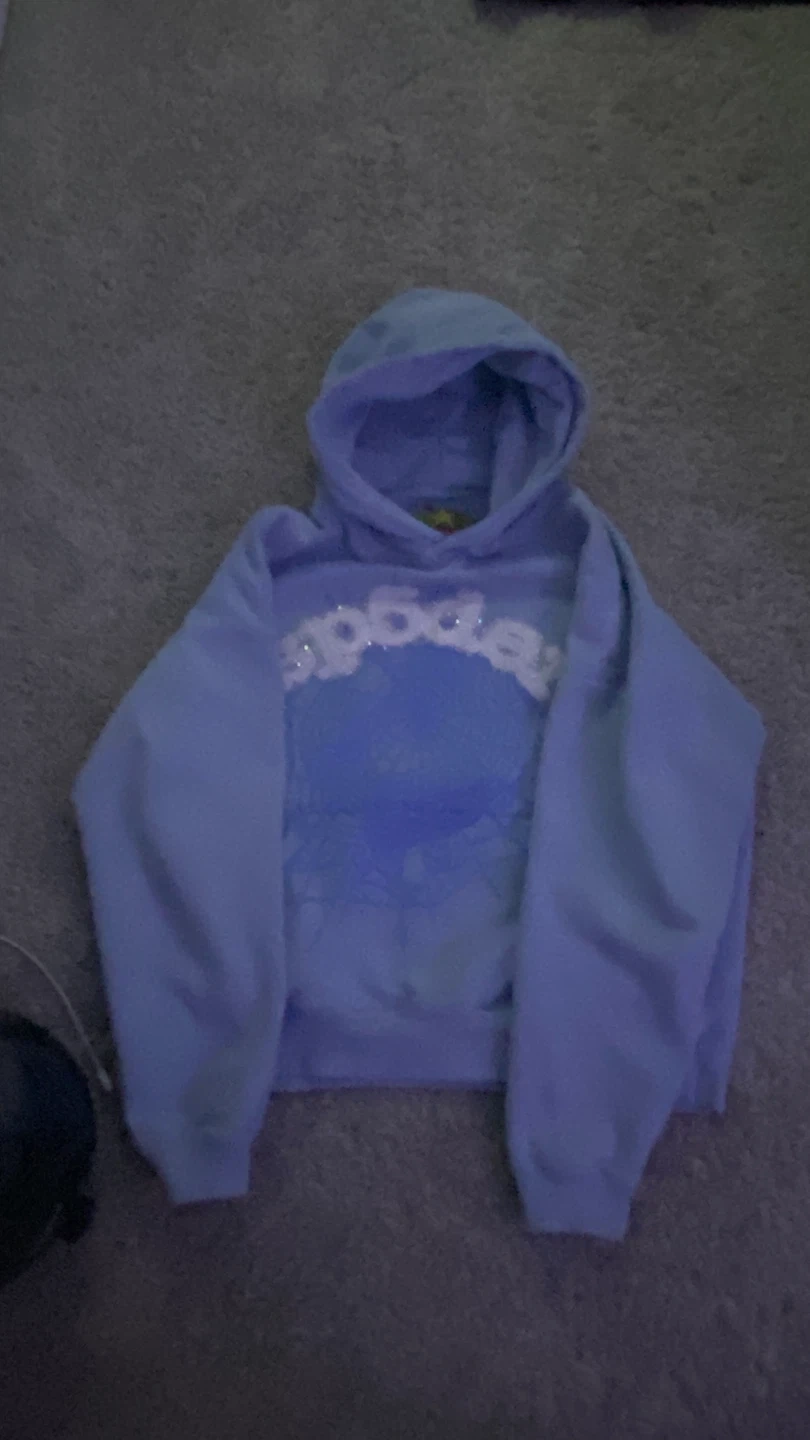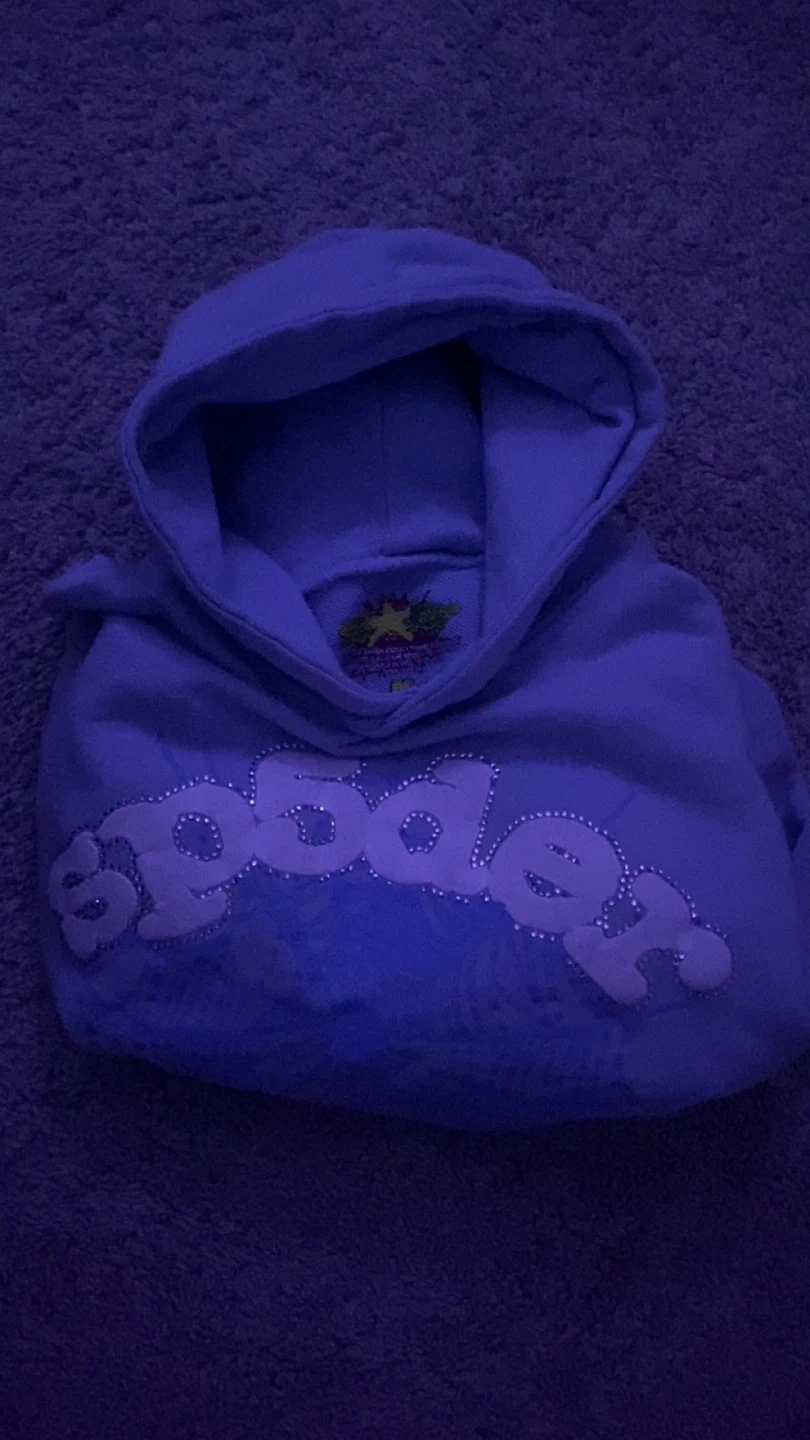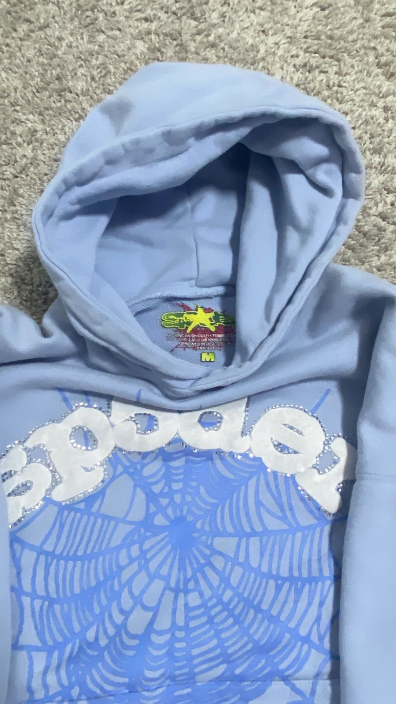 Selling a Sp5der hoodie in a nice light blue colour. It's a size medium fits like a small and features the brand's logo across the front. Perfect for adding a unique piece to your wardrobe!
