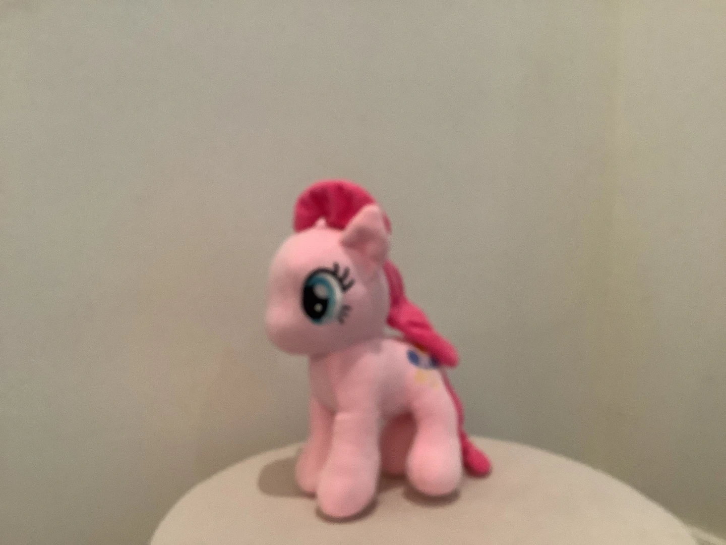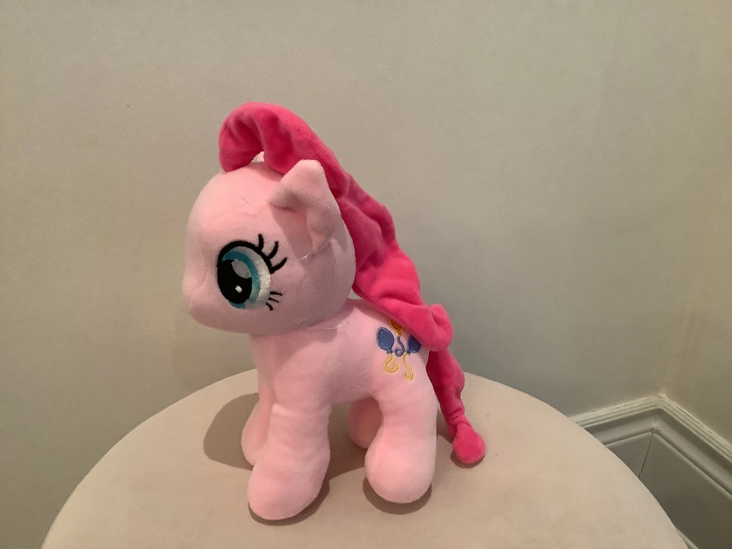 A soft pink plush toy of Pinkie Pie from My Little Pony. It features her signature blue balloons cutie mark and bright pink mane and tail. This stuffed animal is perfect for any My Little Pony fan!
