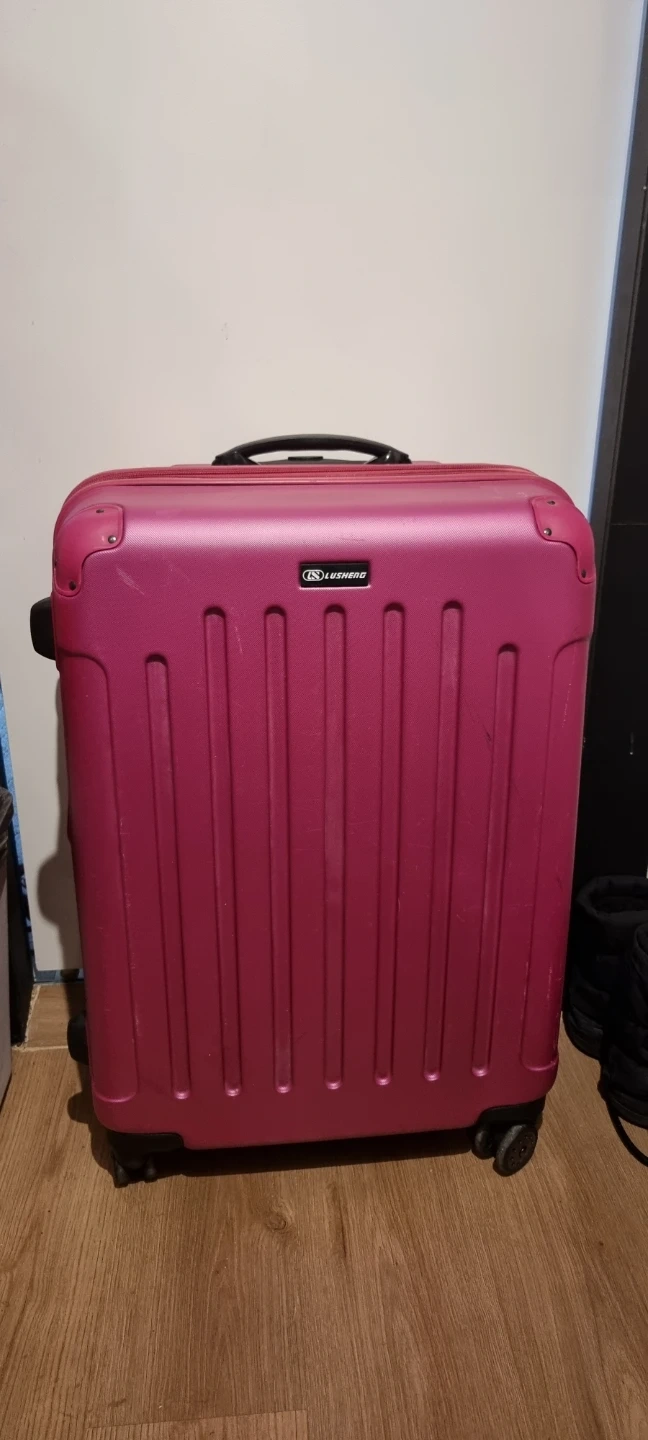 This is a pink Luxardo rolling suitcase. It's a large size with a hard shell exterior. The interior has elastic straps and mesh pockets for organization.