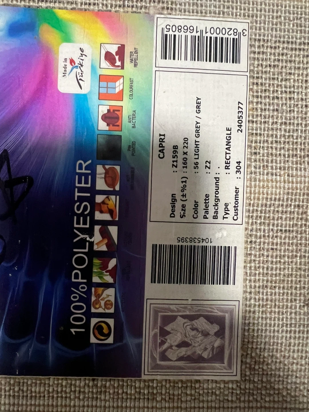 This Capri area rug measures 160 x 220 cm. It's a light grey color with a rectangular shape and palette number Z22. The rug's design is Z159B, and it's made of 100% polyester. It's water-repellent and anti-bacterial. Great for adding a modern touch to your living space!