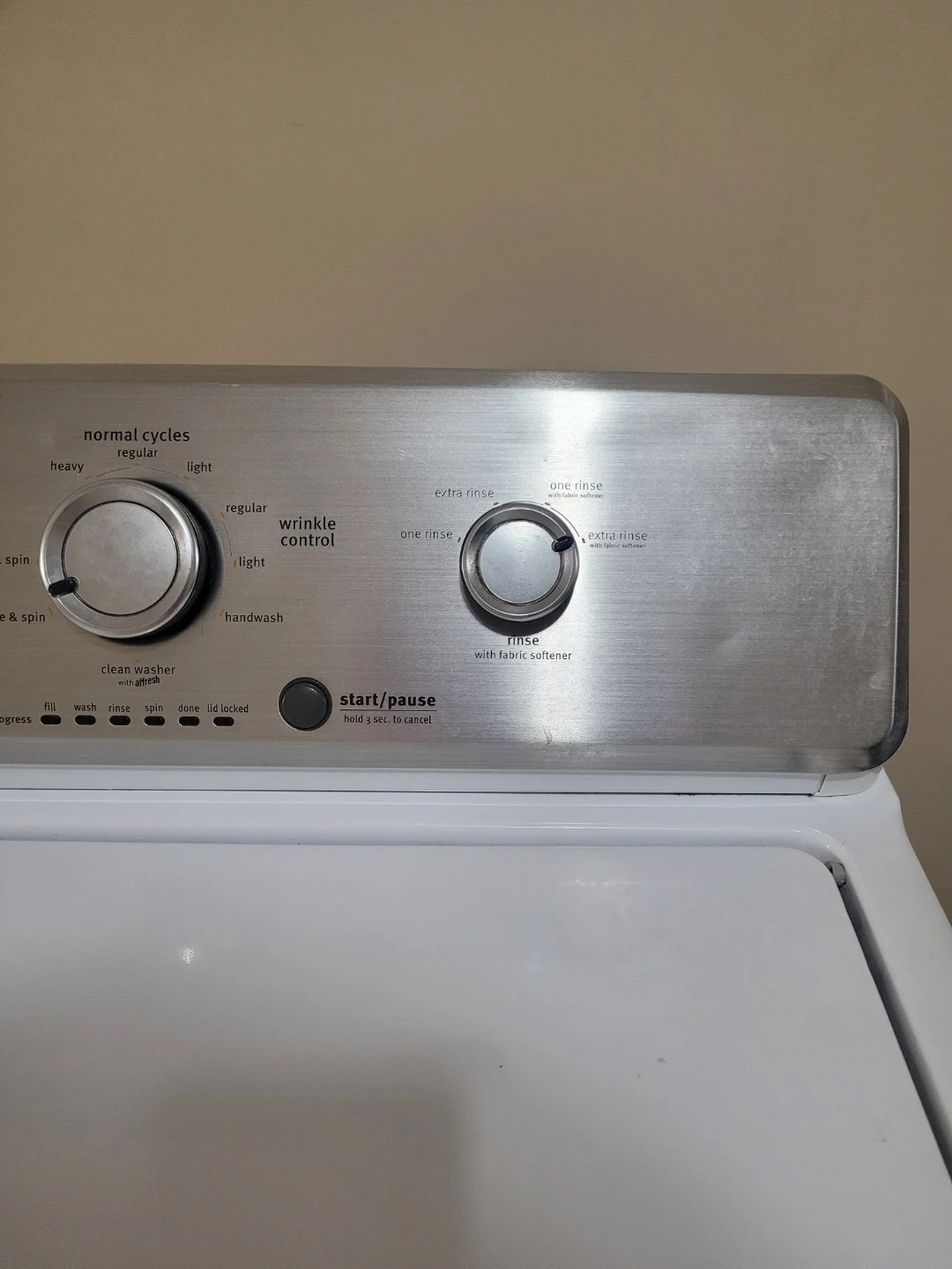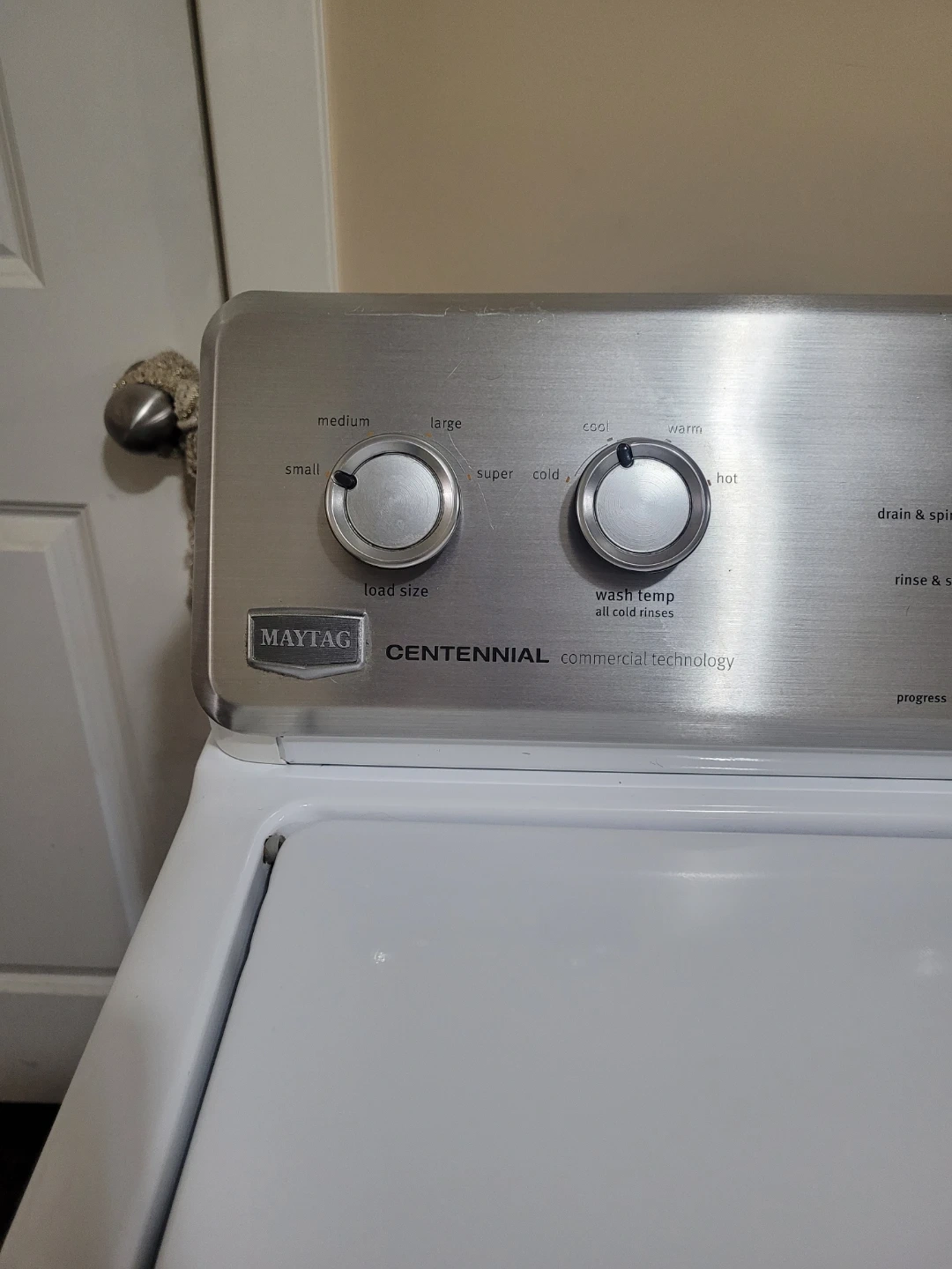 This is a Maytag top-load washing machine with Centennial Commercial Technology. It offers multiple wash cycles, water temperatures, and load sizes. The rinse control includes options for one rinse or extra rinse with fabric softener.