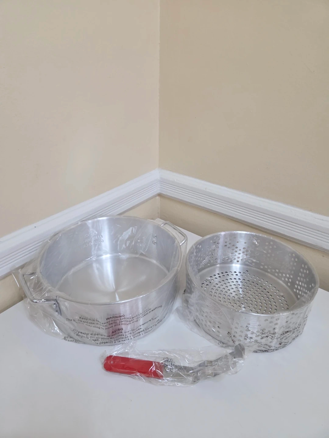 This is an aluminum steamer pot with a perforated insert and a lifting tool. It's designed for cooking and steaming food. The pot has handles for easy lifting.