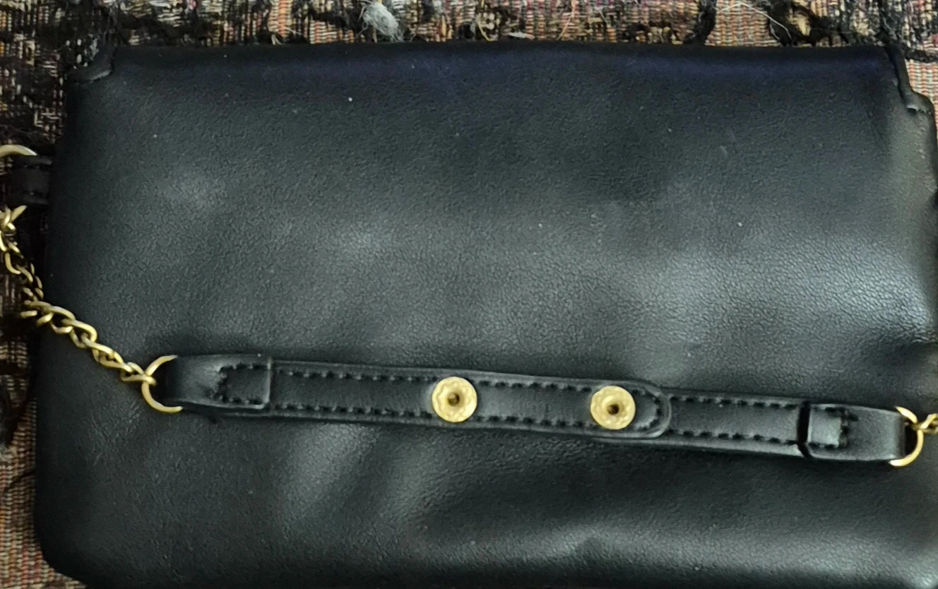 This is a Steve Madden black clutch wallet. It features a gold chain strap and gold snap closure. Interior slots are available. Great for date nights or girls night out! Barely used.