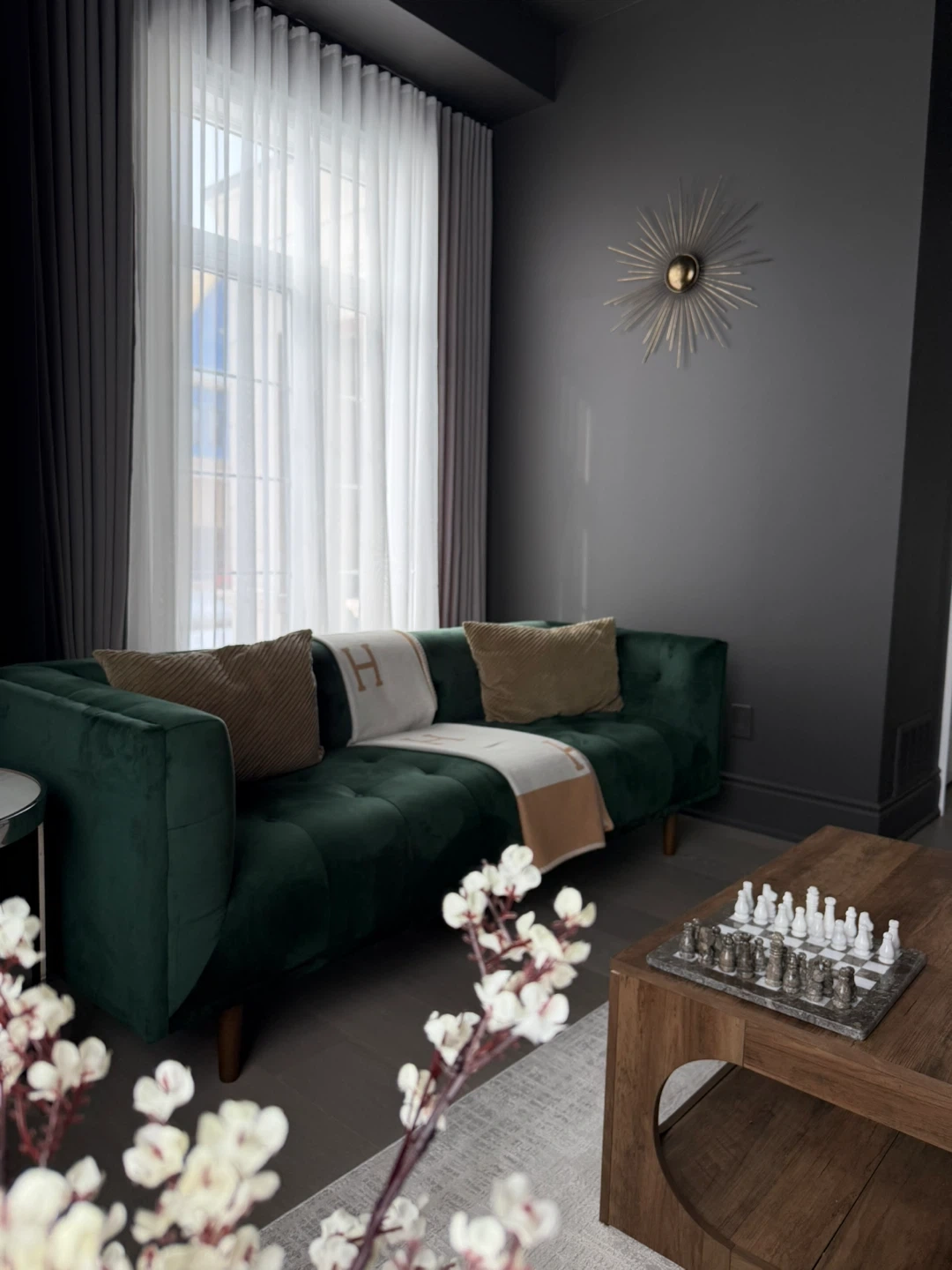 Emerald green 3 seater sofa with throw pillows