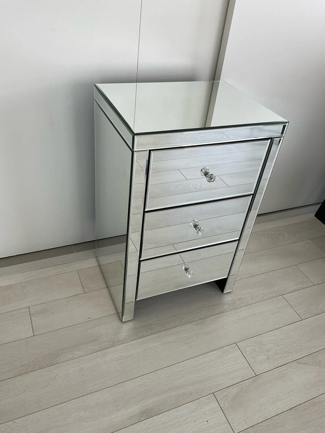 This bevel mirrored nightstand features three drawers and measures 18 inches wide. It is in great condition and ready to enhance your space. No scratches.