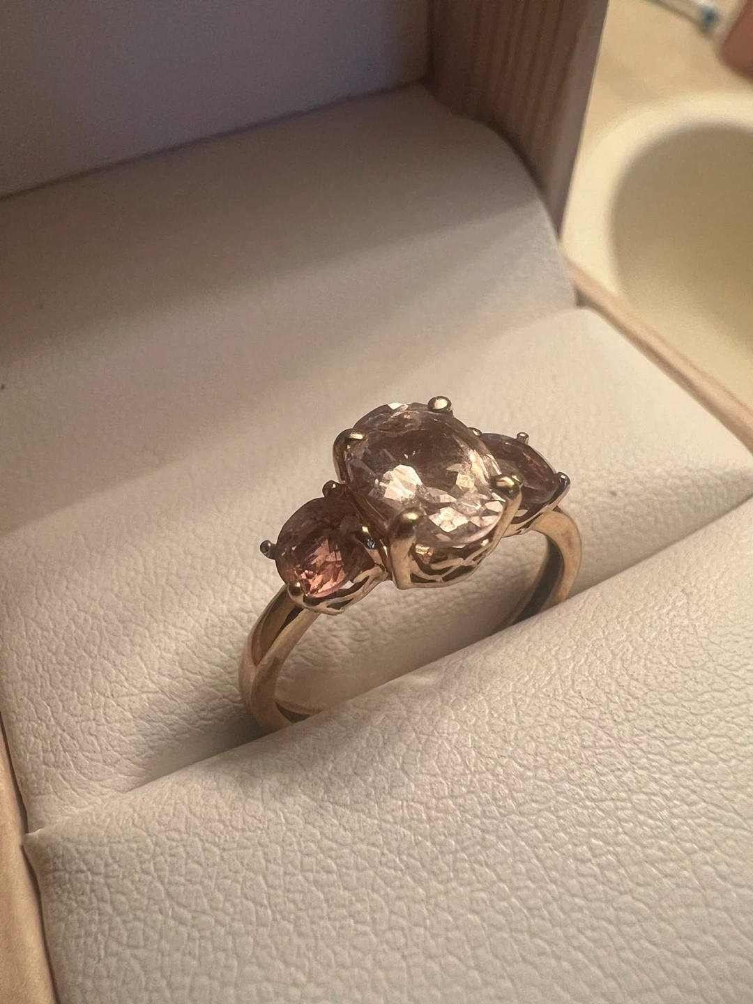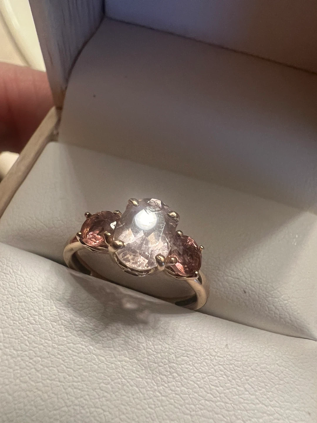 Beautiful 10 k morganite and pink tourmaline ring in a box. It's a stunning piece that would make a lovely addition to any jewelry collection