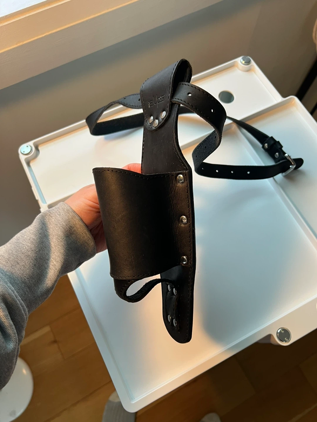 Handmade black leather hip holster. Comes with a small adjustable belt.