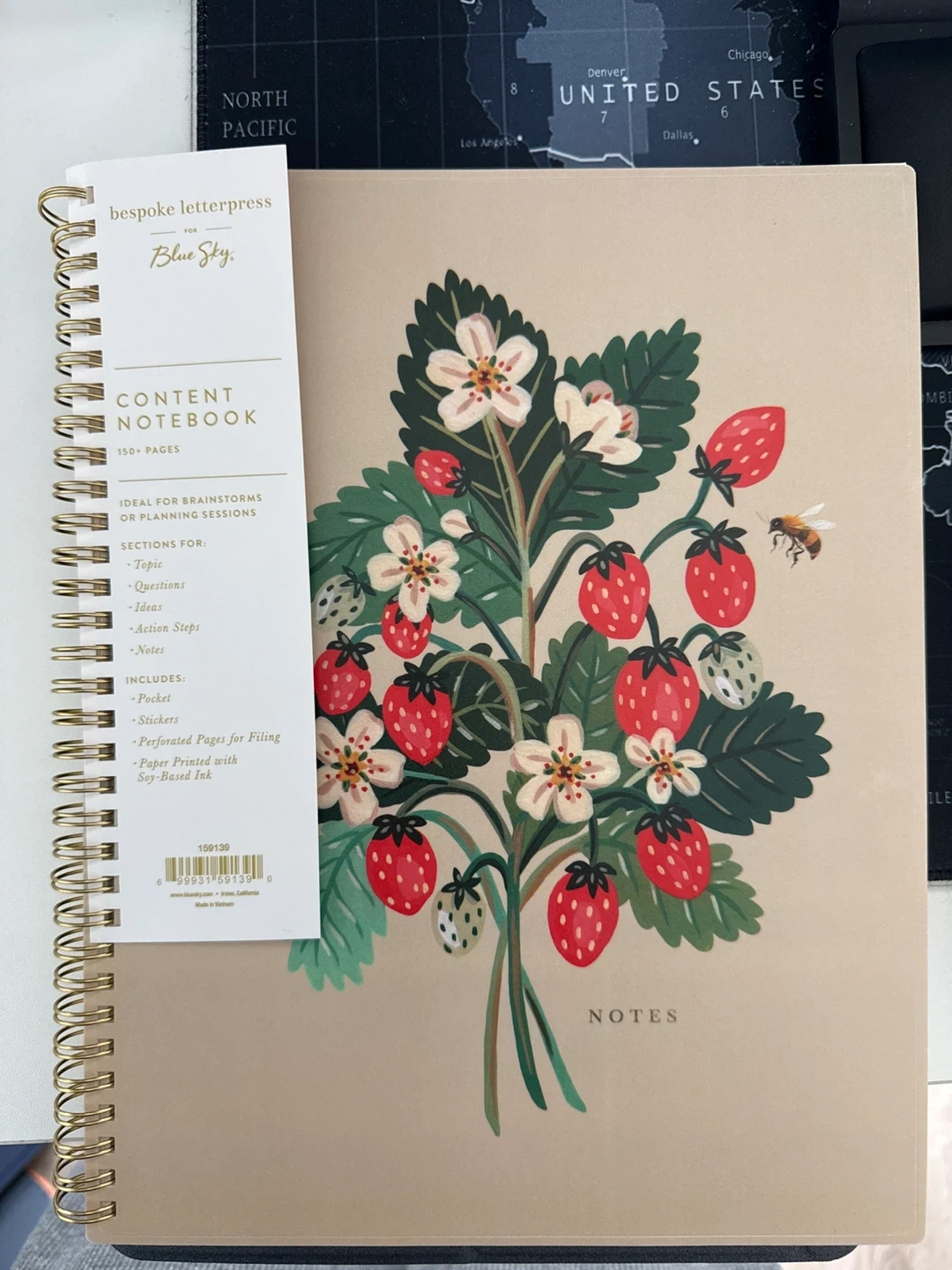 This content notebook is from Blue Sky and Bespoke Letterpress. It features a strawberry design on the cover and includes over 150 pages. It's ideal for brainstorming or planning sessions and comes with a sheet of gold stickers for notes.