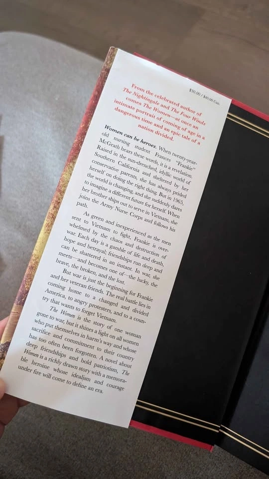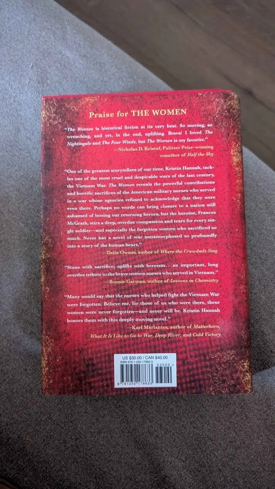 Bestselling Kristin Hannah novel 'The Women'. Hardcover edition. Has red and gold cover design. Back cover includes praise from other authors. Original retail price $40.