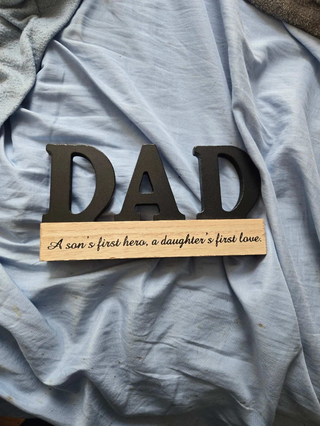 Freestanding wooden sign with "DAD" in black block letters. It sits on a natural wood base with the engraving "A son's first hero, a daughter's first love." A lovely piece for Father's Day or any occasion!