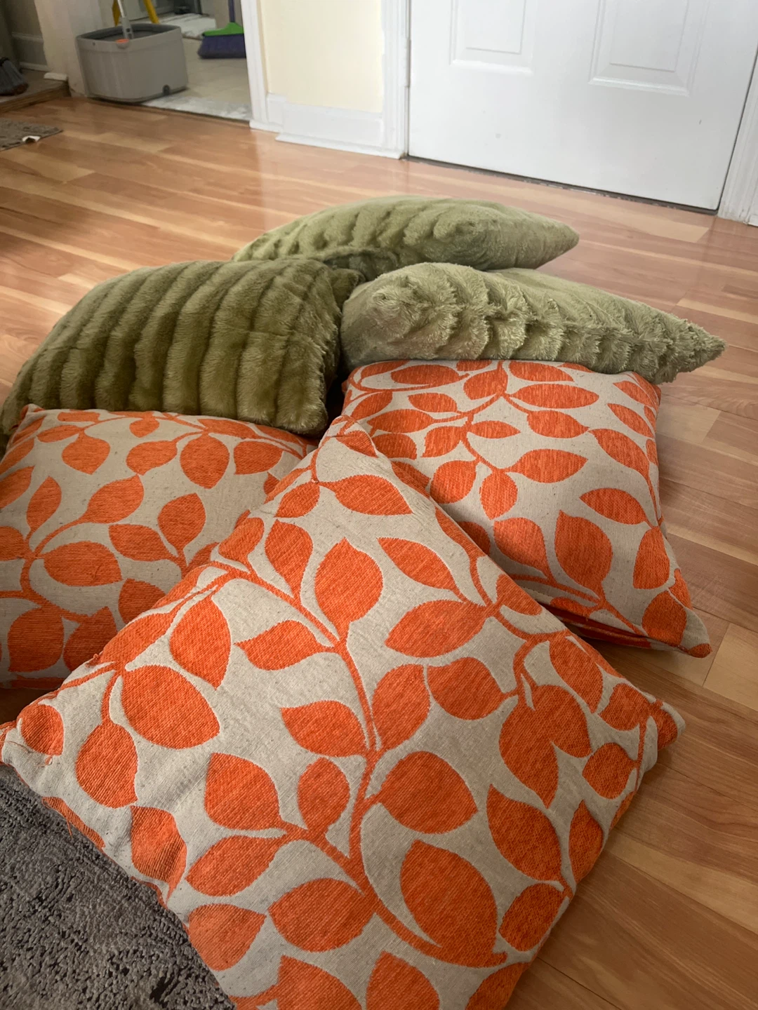 Selling a set of decorative throw pillows. There are two orange leaf print pillows and three green textured pillows. They're in great condition and would look great on any sofa or bed!