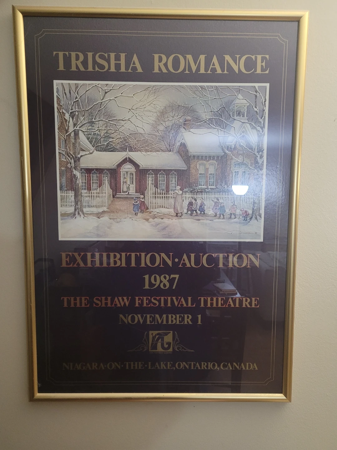 This framed poster advertises the Trisha Romance Exhibition Auction held in 1987. It took place at The Shaw Festival Theatre on November 1st in Niagara-on-the-Lake, Ontario. The artwork depicts a charming winter scene. 34" x 24".