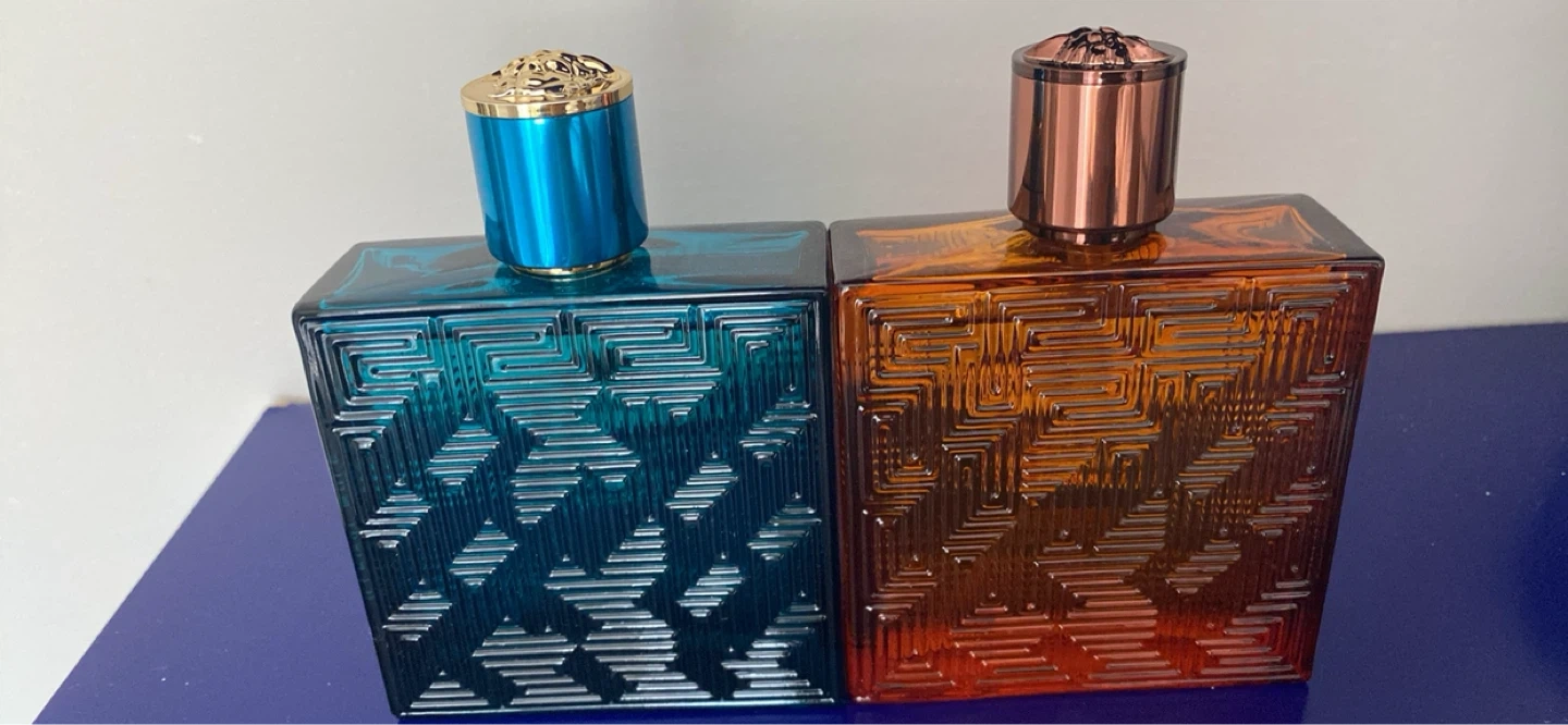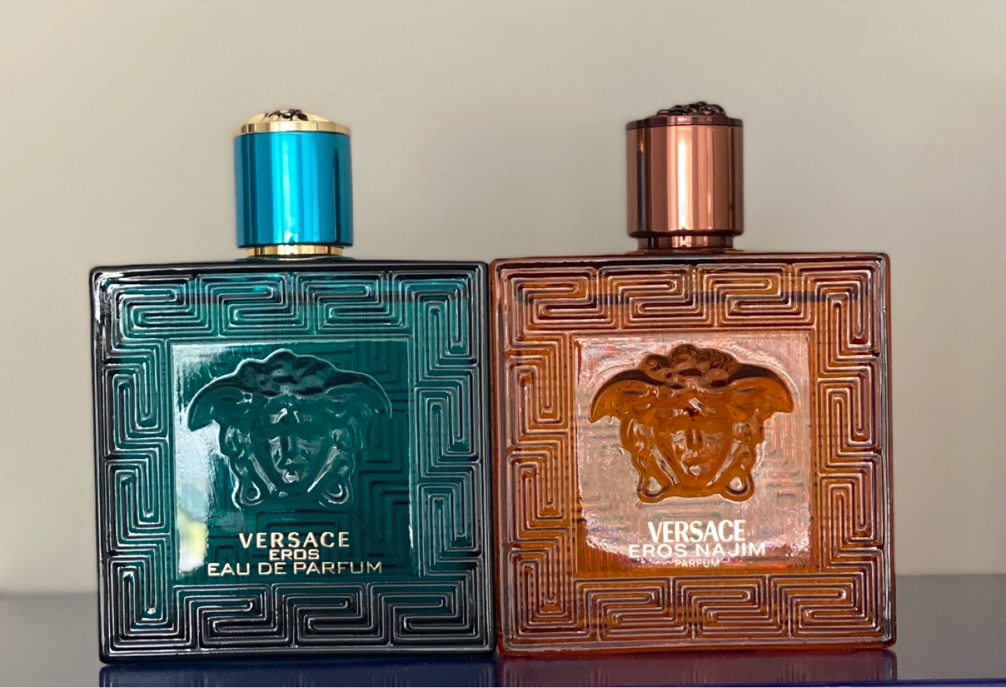 Two Versace Eros fragrances TESTER! No Box. One is Eau de Parfum in a teal bottle, and the other is Parfum in an orange bottle. Both feature the signature Medusa head. $110 each.