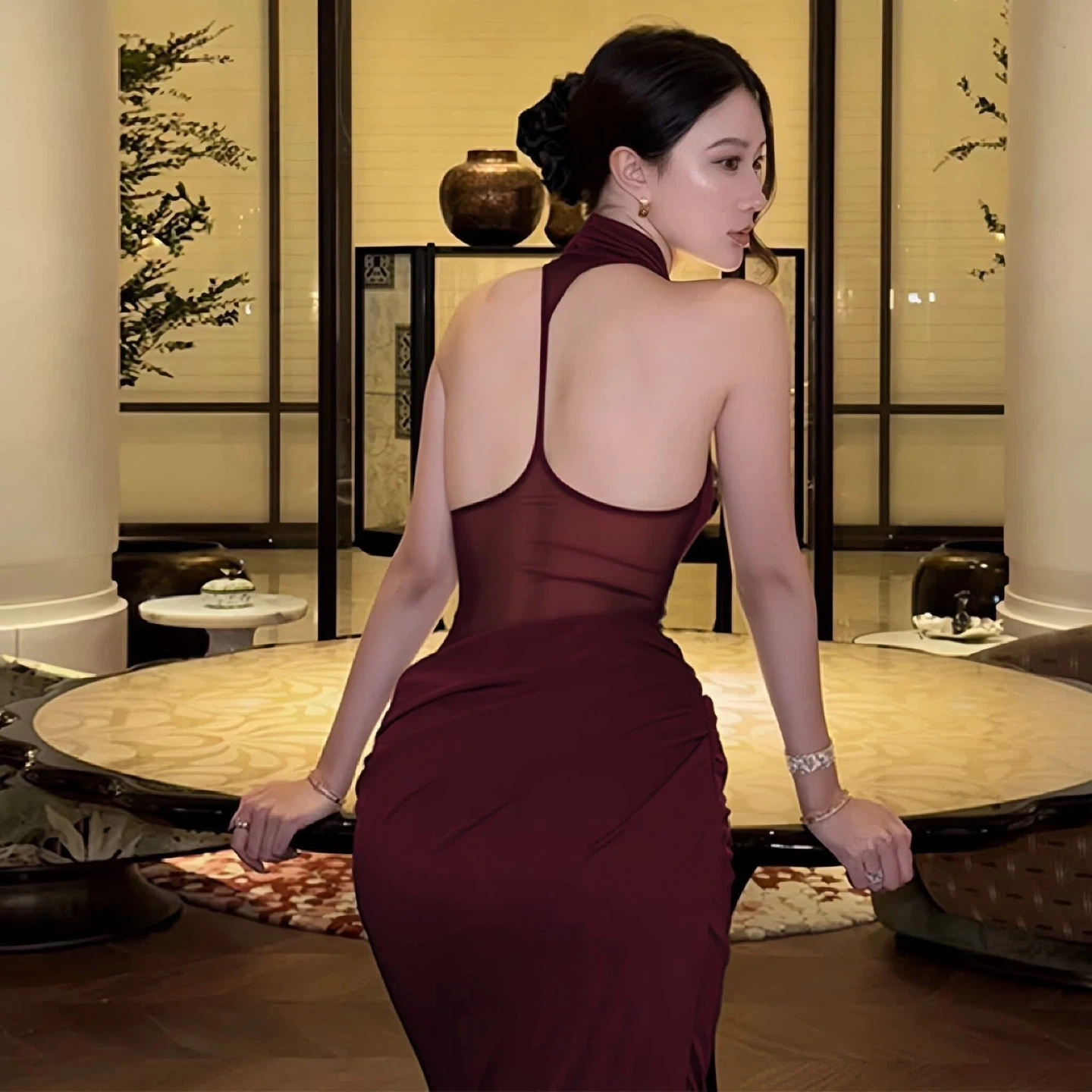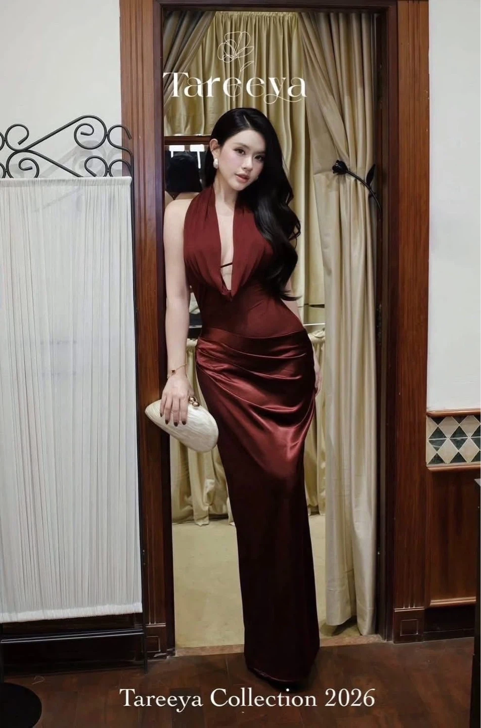 Elegant Tareeya Collection evening gown in a deep burgundy hue. It features a striking halter neckline and a draped silhouette with sheer paneling. This dress is perfect for formal events and special occasions!