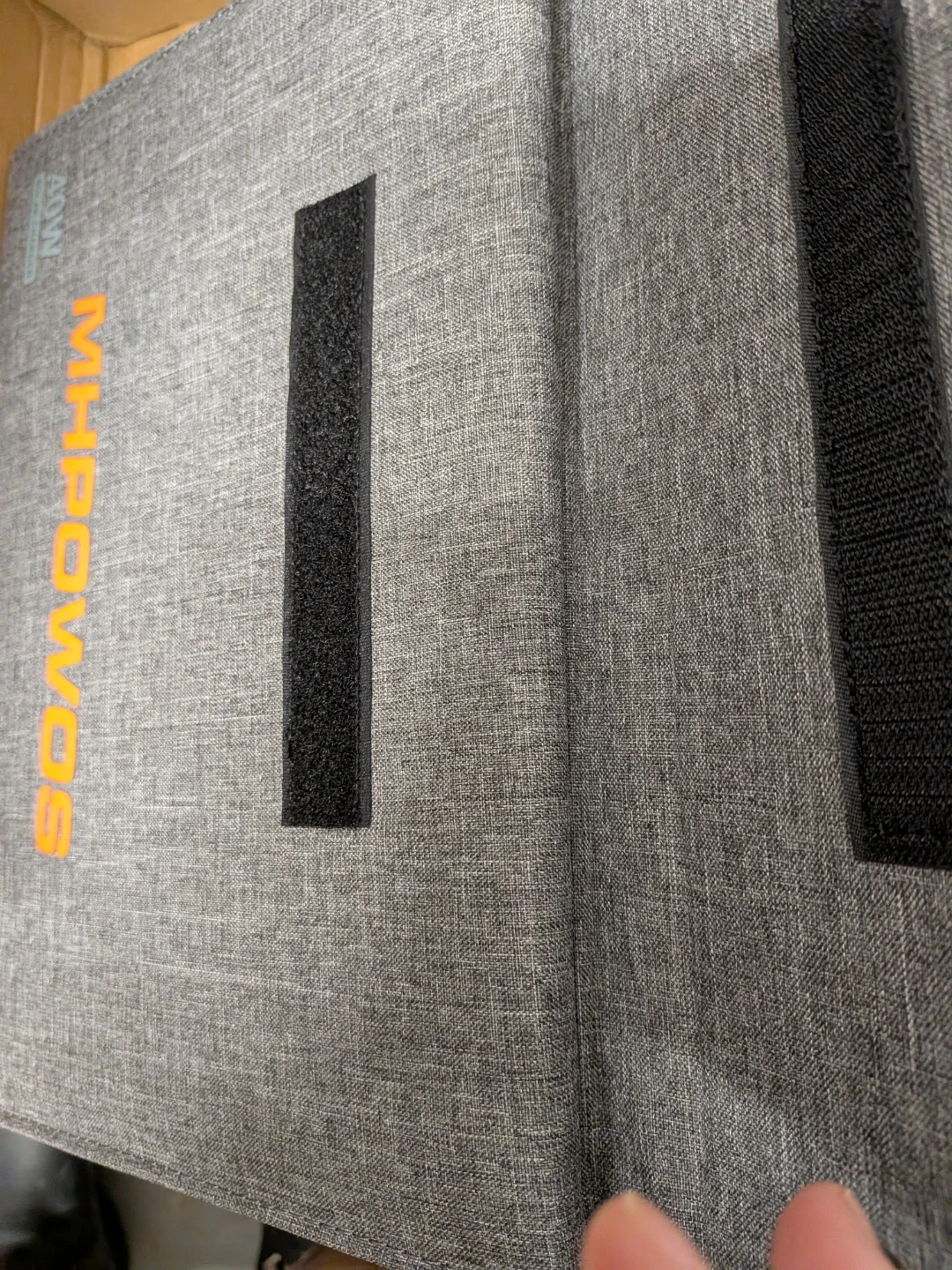 This is a MHPOWOS 60W foldable solar panel charger. It's made of durable fabric and has multiple solar panels. Includes hook-and-loop fasteners for securing it when folded.
