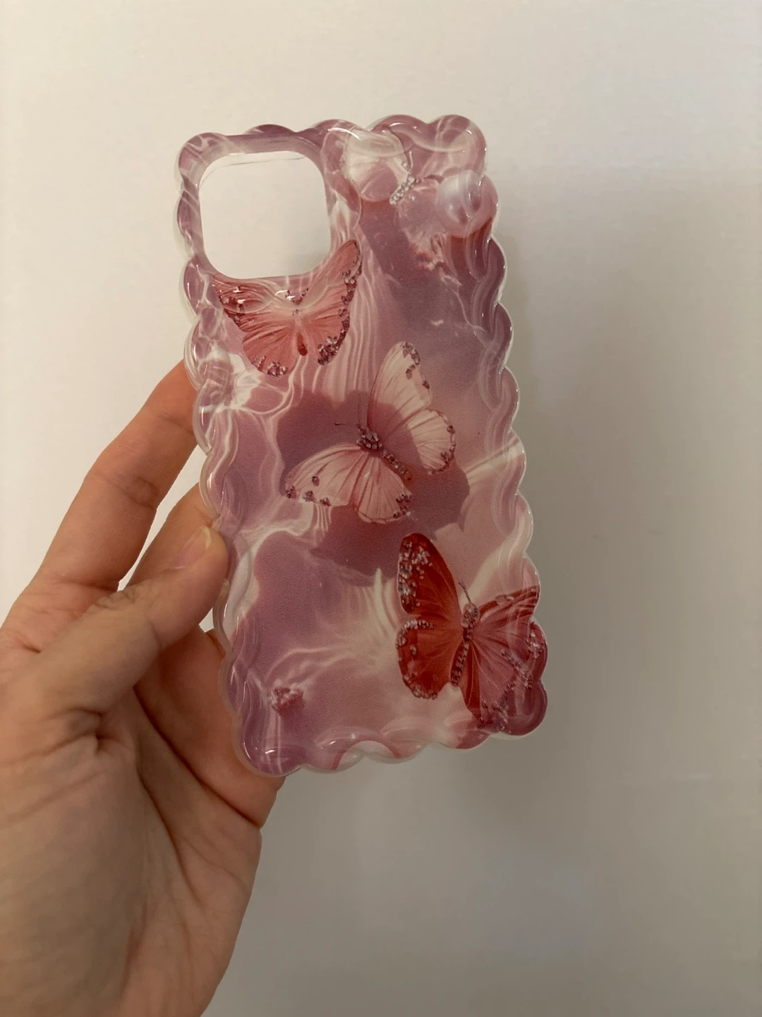 This phone case features a pink marble pattern with delicate butterfly designs. It has a wavy, textured edge for added grip and style. Offers protection with a cute, decorative look!