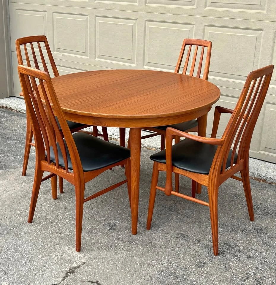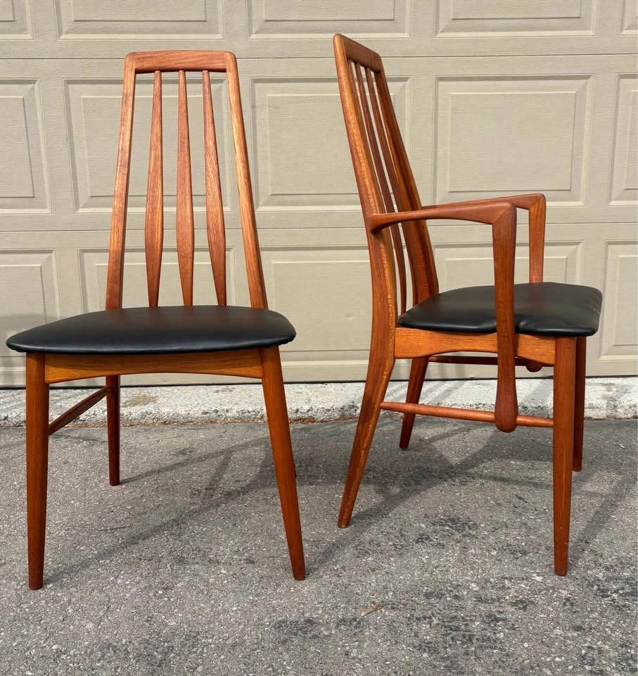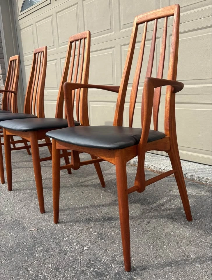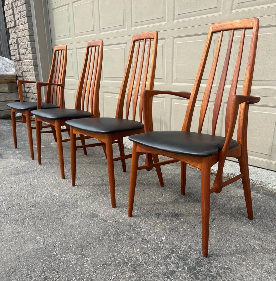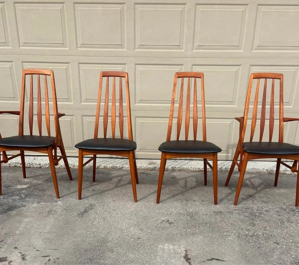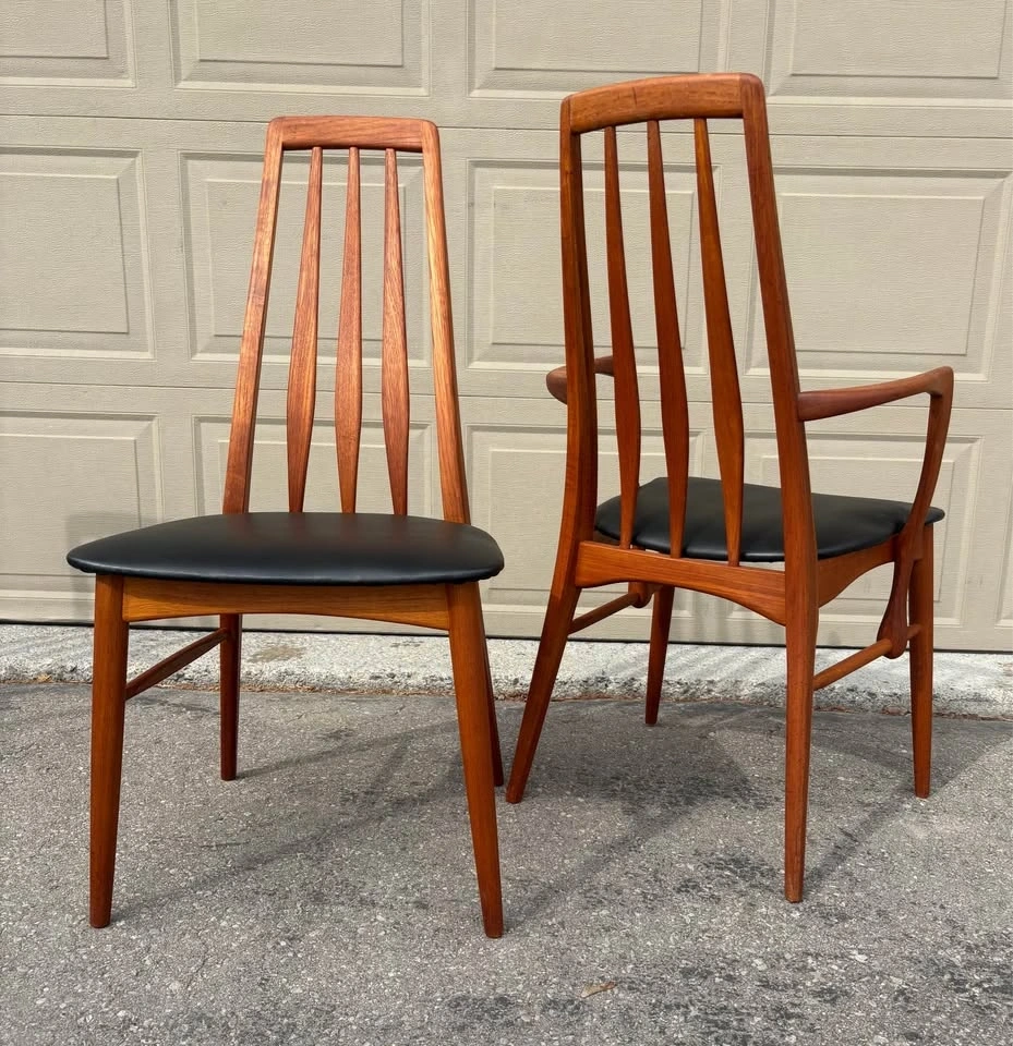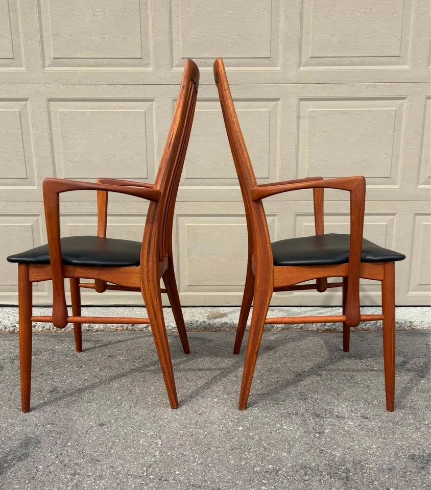 Iconic Danish MCM dining chairs designed by Niles Koefoed. This is the highly sought after “ Eva” model. Chairs have been completely refurbished, all new black vegan leather upholstery. Frames stripped to raw wood, all joints inspected, and finished with several coats of hand rubbed Danish oil. Set consists of two side chairs and two arm chairs. Price listed is per chair. Let me know if you're interested!