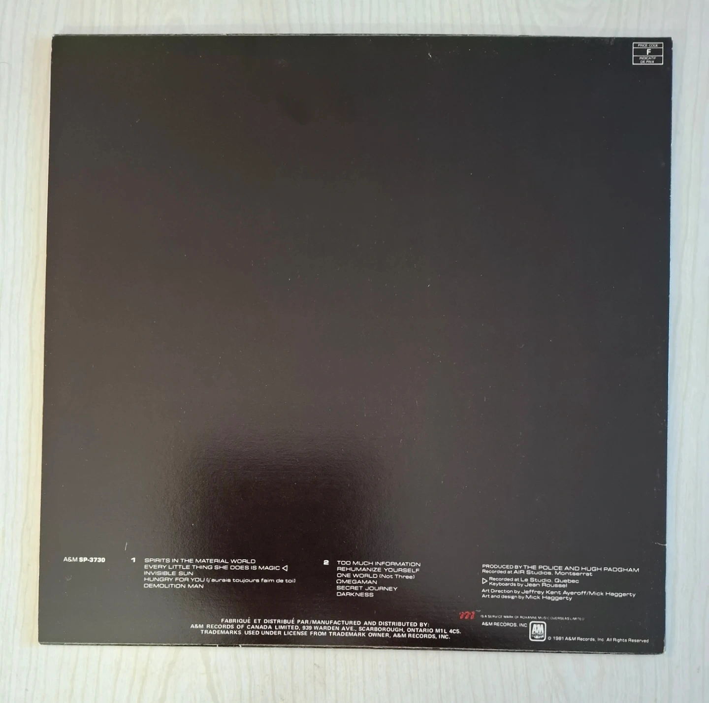 This is the vinyl record LP for The Police's album, Ghost in the Machine. It was produced by The Police and Hugh Padgham. All tracks were recorded at Le Studio, Quebec and mixed at Eden Terrace, London.