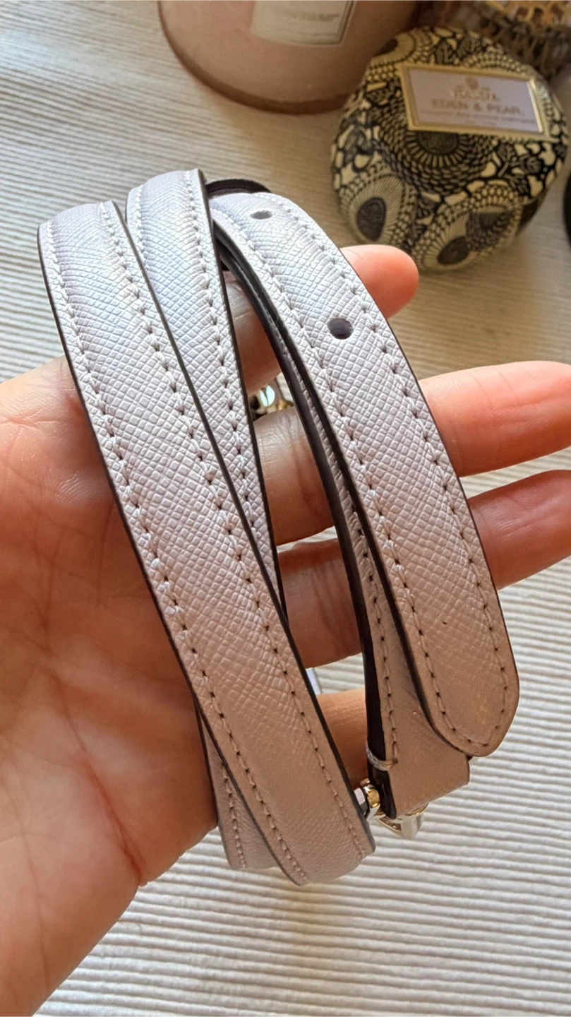 This is a Kate Spade crossbody strap. It's made of Saffiano leather and has silver-tone hardware. It's a versatile accessory for your favourite bag. It would be great for adding a pop of colour to your outfit!