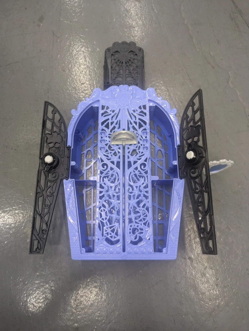 Selling a Monster High coffin bed doll furniture set. It appears to be in good condition and comes with a small mirror accessory. Perfect for any Monster High fan!