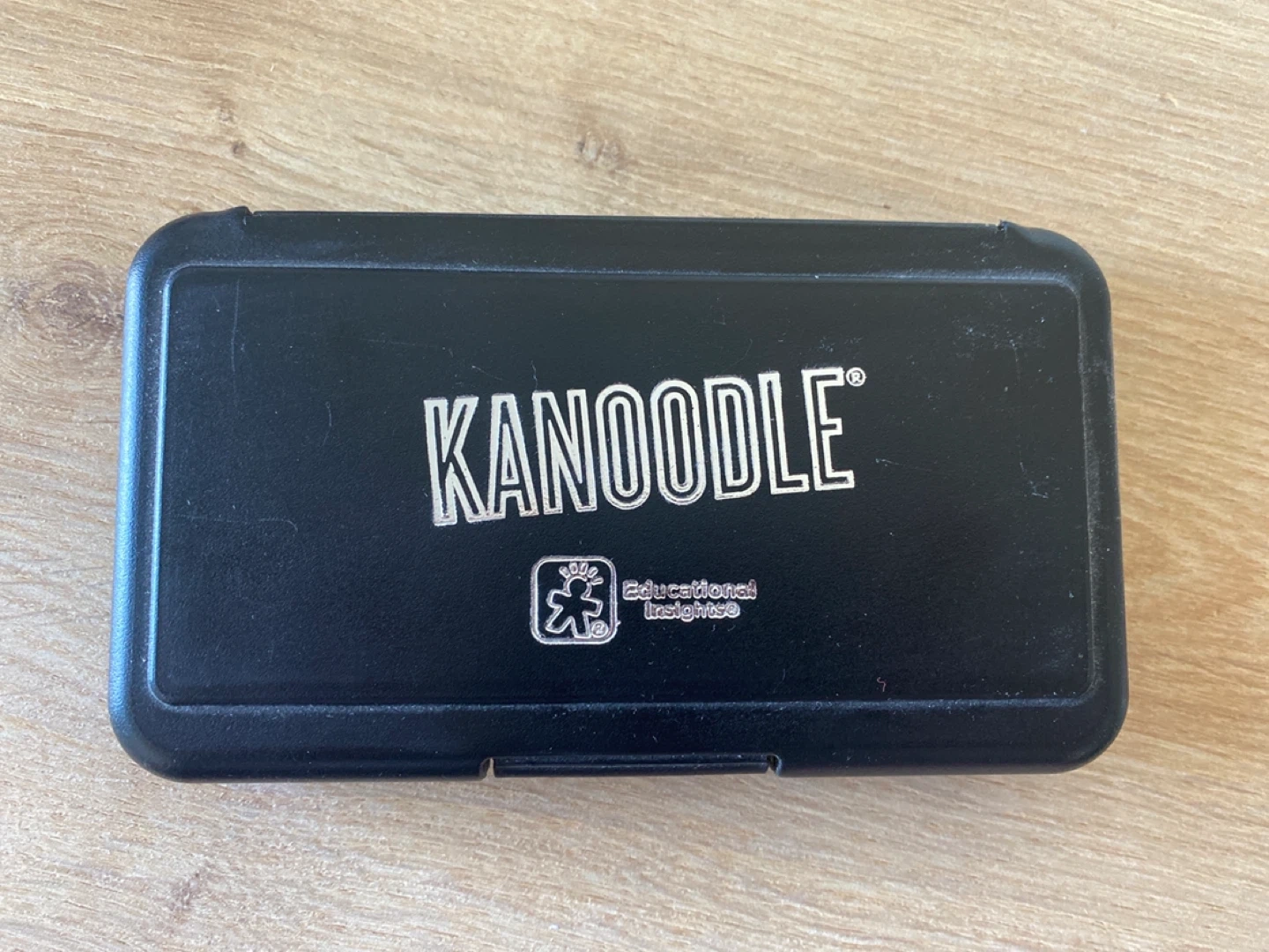 This is the Kanoodle puzzle game by Educational Insights. It includes a black carrying case with a puzzle board and colourful noodle pieces. Comes with challenge cards for various levels.