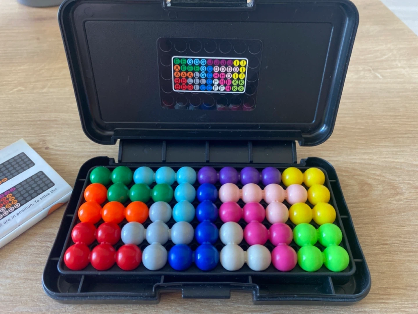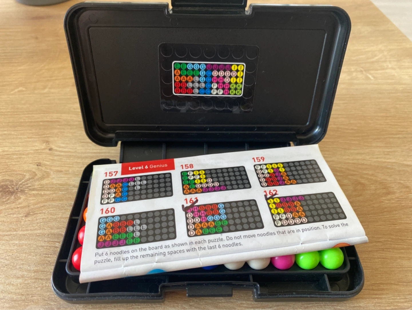 This is the Kanoodle puzzle game by Educational Insights. It includes a black carrying case with a puzzle board and colourful noodle pieces. Comes with challenge cards for various levels.