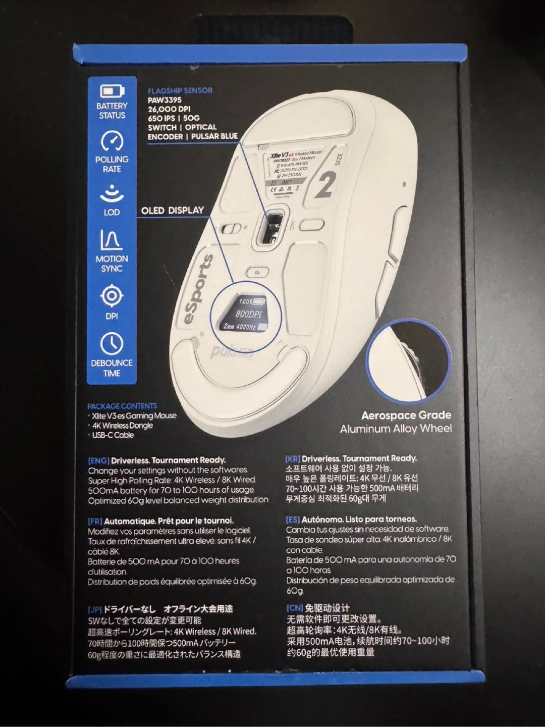The Xlite V3 eS model stands out from regular mice with its unique features. It is equipped with an OLED display on the bottom surface, allowing for quick and driver-free customization of desired settings*. Users can check the battery status and configure various settings such as polling rate, LOD (Lift-off Distance), Motion sync, DPI (400, 800, 1600, 3200, 6400 or 12800), and Debounce time.