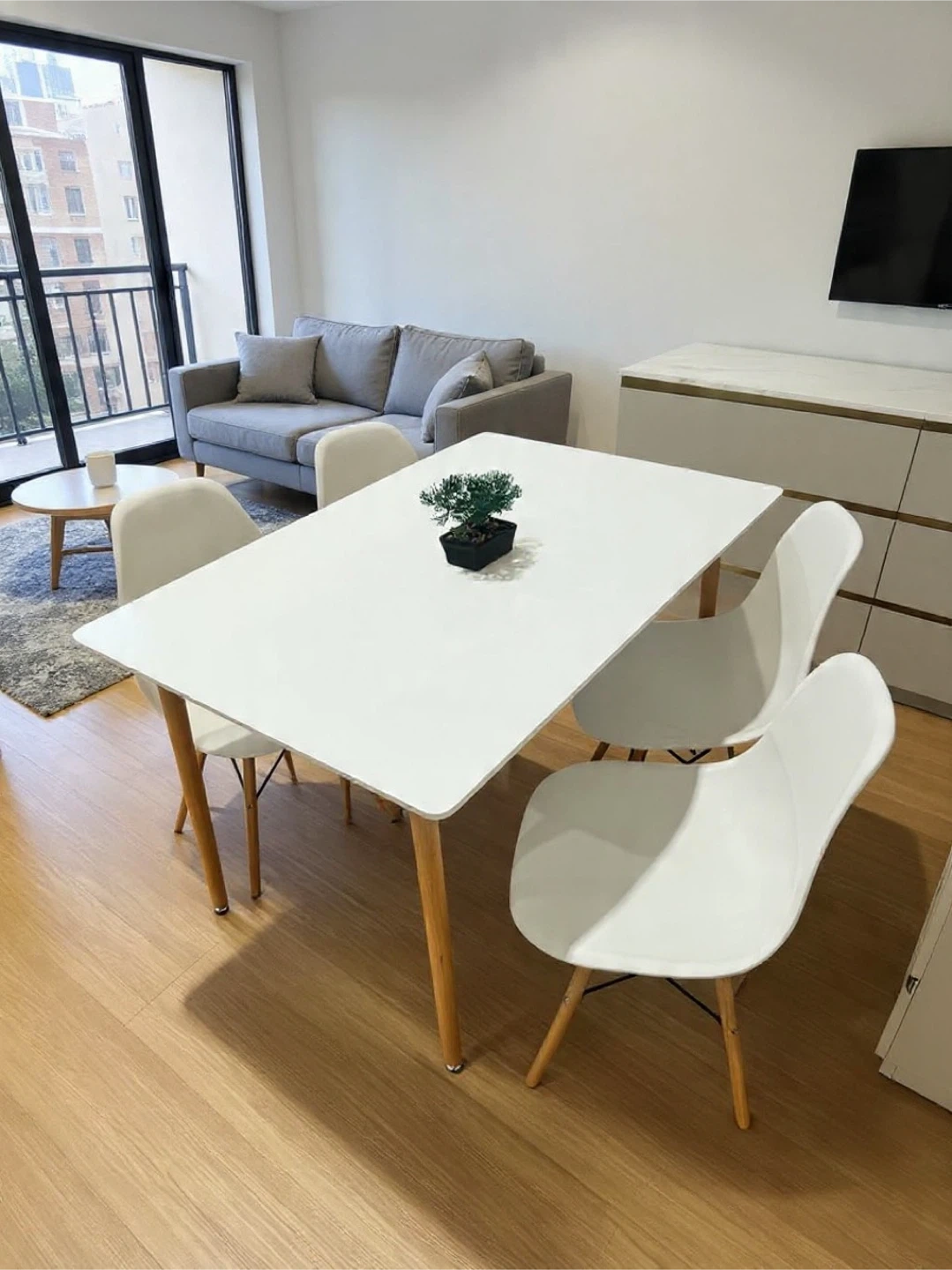 Selling a simple and stylish white dining table, perfect for a small dining area or kitchen. It comes with four matching white chairs. The table has wooden legs, adding a touch of warmth to the overall design. It's in great condition and ready to find a new home!