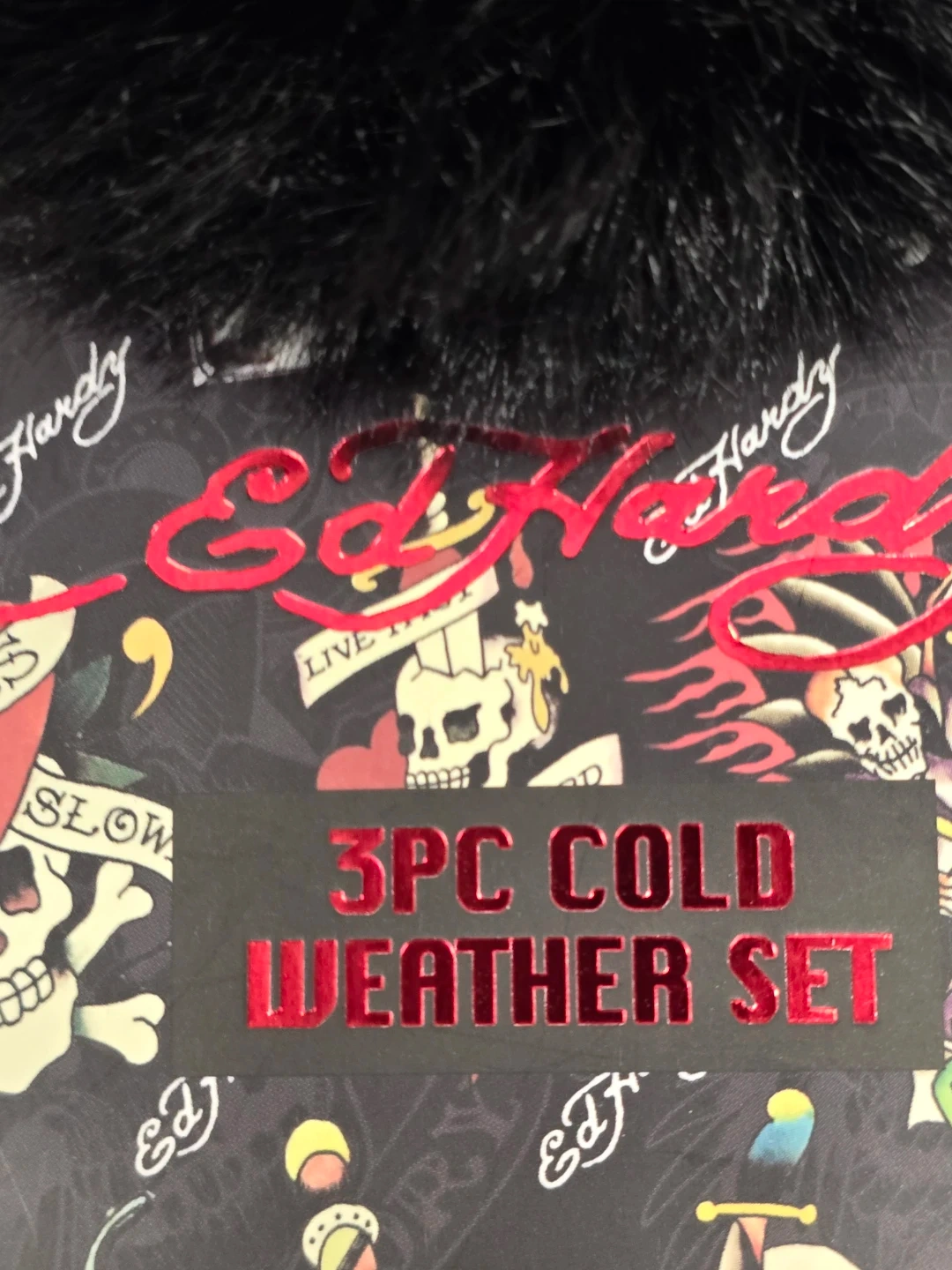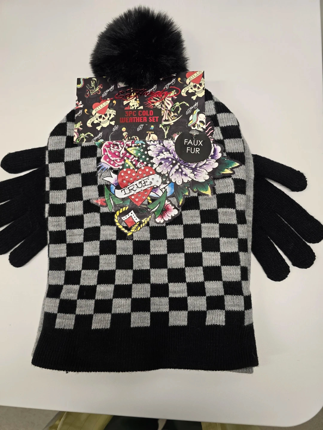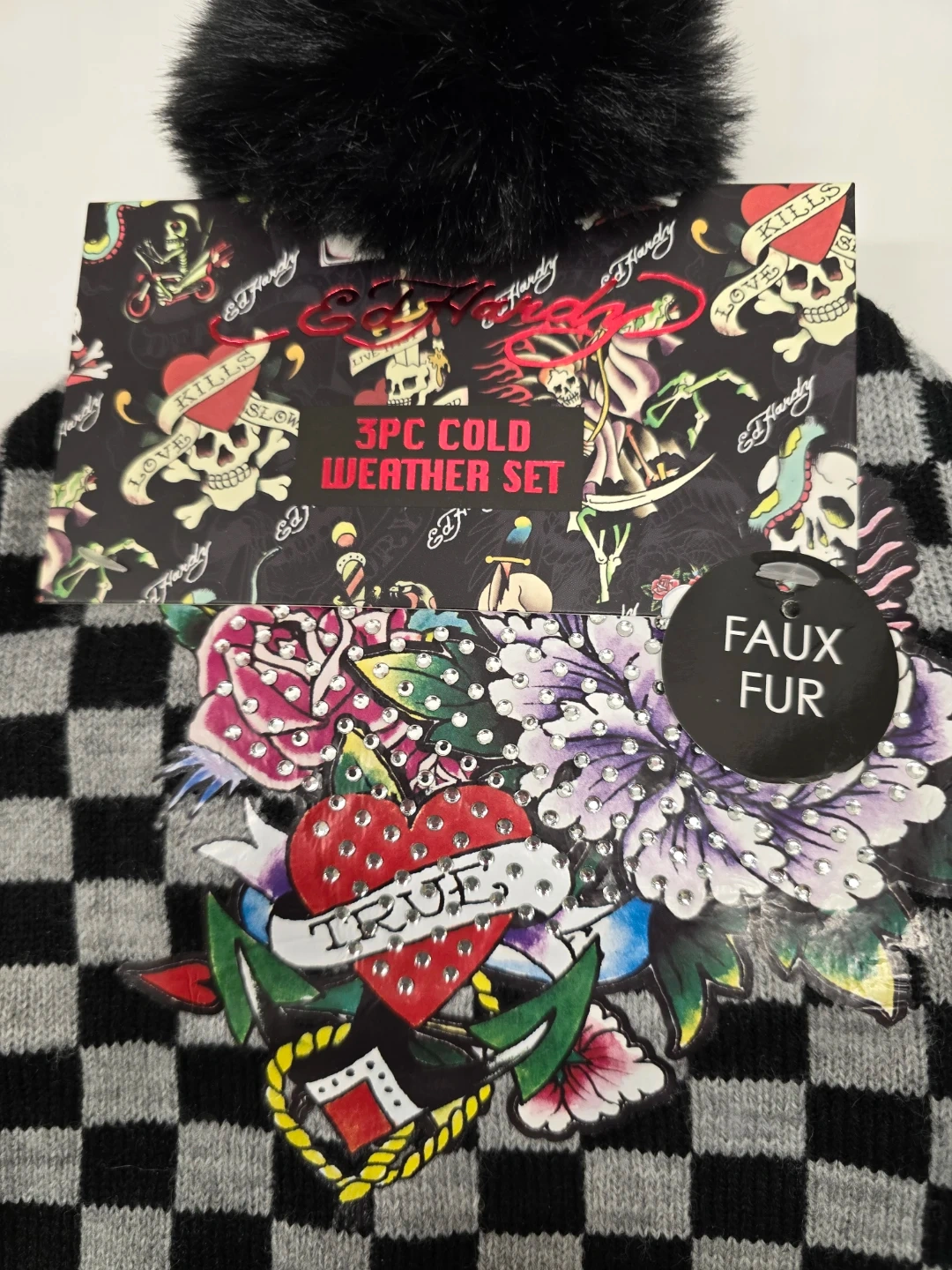 Keep cozy with this Ed Hardy 3-piece cold weather set! It includes a hat with a faux fur pompom and matching gloves. The hat features a cool checkered pattern and the iconic Ed Hardy logo